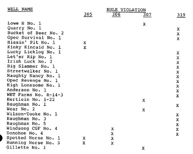 5. Testimony presented at the hearing on March 20, 1989 using Exhibit C detailed the lack of filings required for the well listed herein. The lack of filings is a violation of the Rules and Regulations of the Commission.