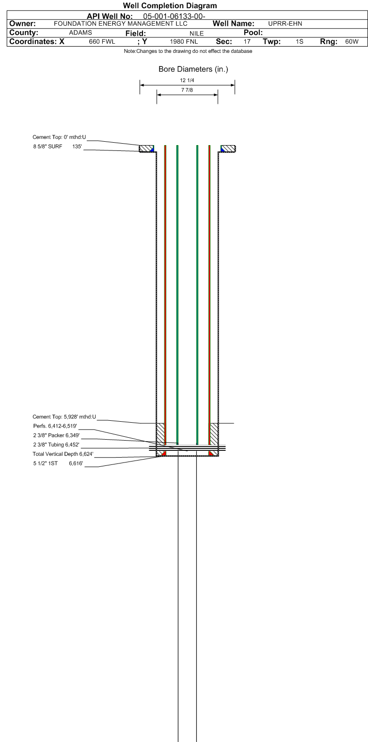 | Wellbore Completed | | Completion Date: | 4/12/1988 | | Spud Date: | 3/5/1970 | Spud Date Is: | ACTUAL | | Measured TD: | 6624 ft. | Measured PB depth: | 6584 ft. | | True Vertical TD: | 6624 ft. | True Vertical PB depth: | | | Log Types: | TEMPERATURE SURVEY | | Casing: | String Type: SURF, Hole Size: 12.25 in., Size: 8.625 in., Top: 0 ft., Depth: 135 ft., Weight: 24 , Citings Type: ACTUAL | | Cement: | Sacks: 150, Top: 0 ft., Bottom: 135 ft., Determination Method: | | Casing: | String Type: 1ST, Hole Size: 7.875 in., Size: 5.5 in., Top: 0 ft., Depth: 6616 ft., Weight: 15.5 , Citings Type: ACTUAL | | Cement: | Sacks: 140, Top: 5928 ft., Bottom: 6616 ft., Determination Method: CALC | | Formation | Interval Top | Log Bottom | Cored | DSTs | | D SAND | 6410 ft. | | | | | J SAND | 6475 ft. | | | |