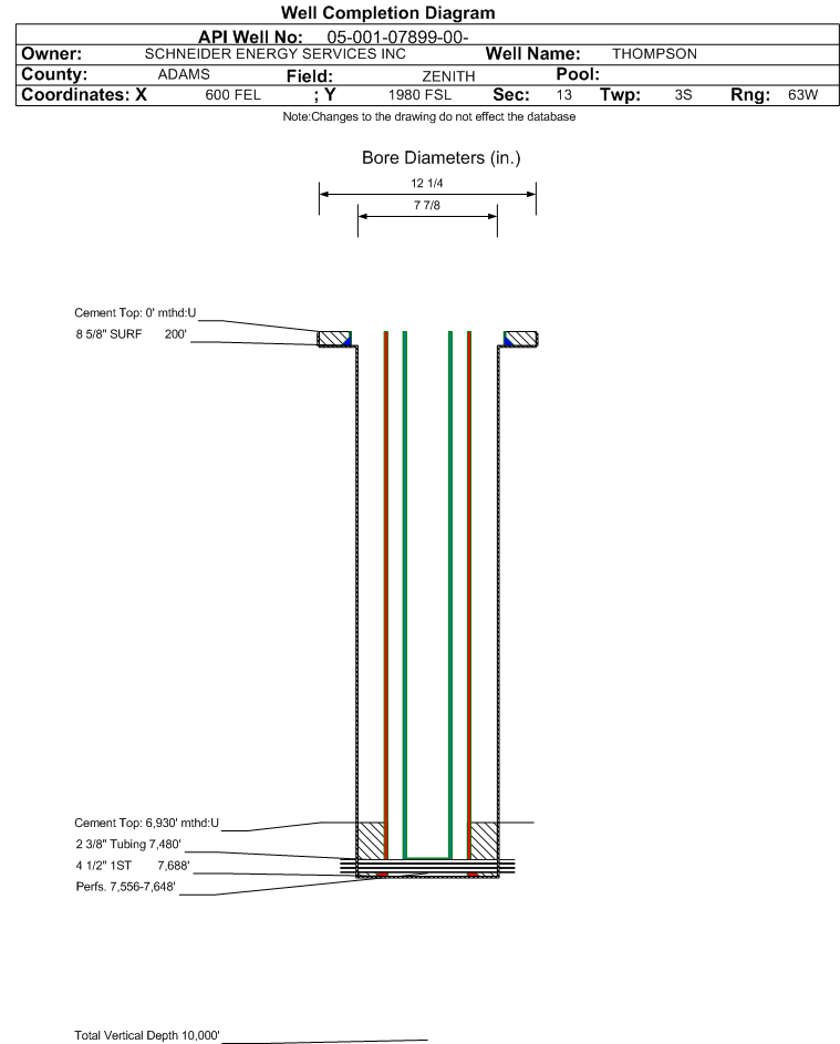 Wellbore Completed | Completion Date: | 9/30/1981 | Spud Date: | 8/1/1981 | Spud Date Is: | ACTUAL | Measured TD: | 7690 ft. | Measured PB depth: | 7688 ft. | True Vertical TD: | | True Vertical PB depth: | | Log Types: | IEL, CDL-GAMMA, DIPMETER | Casing: | String Type: SURF, Hole Size: 12.25 in., Size: 8.625 in., Top: , Depth: 200 ft., Weight: 24 , Citings Type: ACTUAL | Cement: | Sacks: 200, Top: 0 ft., Bottom: 200 ft., Determination Method: VISU | Casing: | String Type: 1ST, Hole Size: 7.875 in., Size: 4.5 in., Top: , Depth: 7688 ft., Weight: 11.6 , Citings Type: ACTUAL | Cement: | Sacks: 200, Top: 6930 ft., Bottom: 7688 ft., Determination Method: CBL | Formation | Interval Top | Log Bottom | Cored | DSTs | FOX HILLS | 1192 ft. | | N | N | FOX HILLS BASE | 1332 ft. | | N | N | SUSSEX | 4588 ft. | | N | N | NIOBRARA | 6698 ft. | | N | N | FORT HAYS | 7085 ft. | | N | N | CARLILE | 7114 ft. | | N | N | GREENHORN | 7188 ft. | | N | N | BENTONITE | 7400 ft. | | N | N | D SAND | 7491 ft. | | N | N | HUNTSMAN | 7499 ft. | | N | N | J SAND | 7553 ft. | | N | N | SKULL CREEK | 7669 ft. | | N | N |