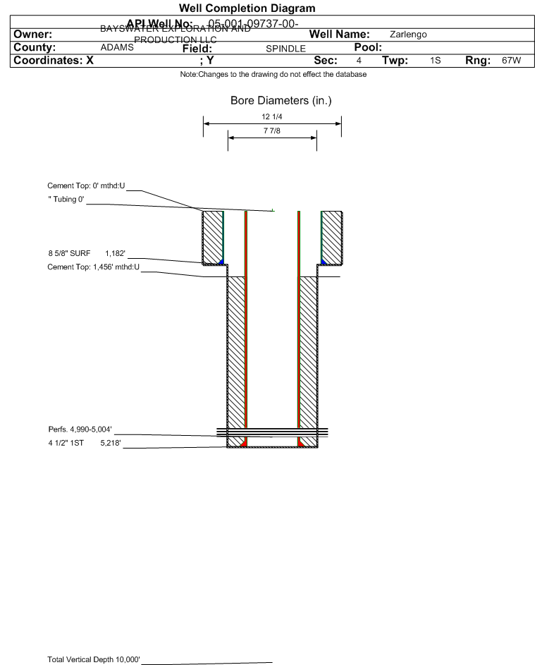 | | Perforation Data: | | Interval Top: | 4990 ft. | # Of Holes: | 112 | | Interval Bottom: | 5004 ft. | Hole Size: | 0.42 in. |