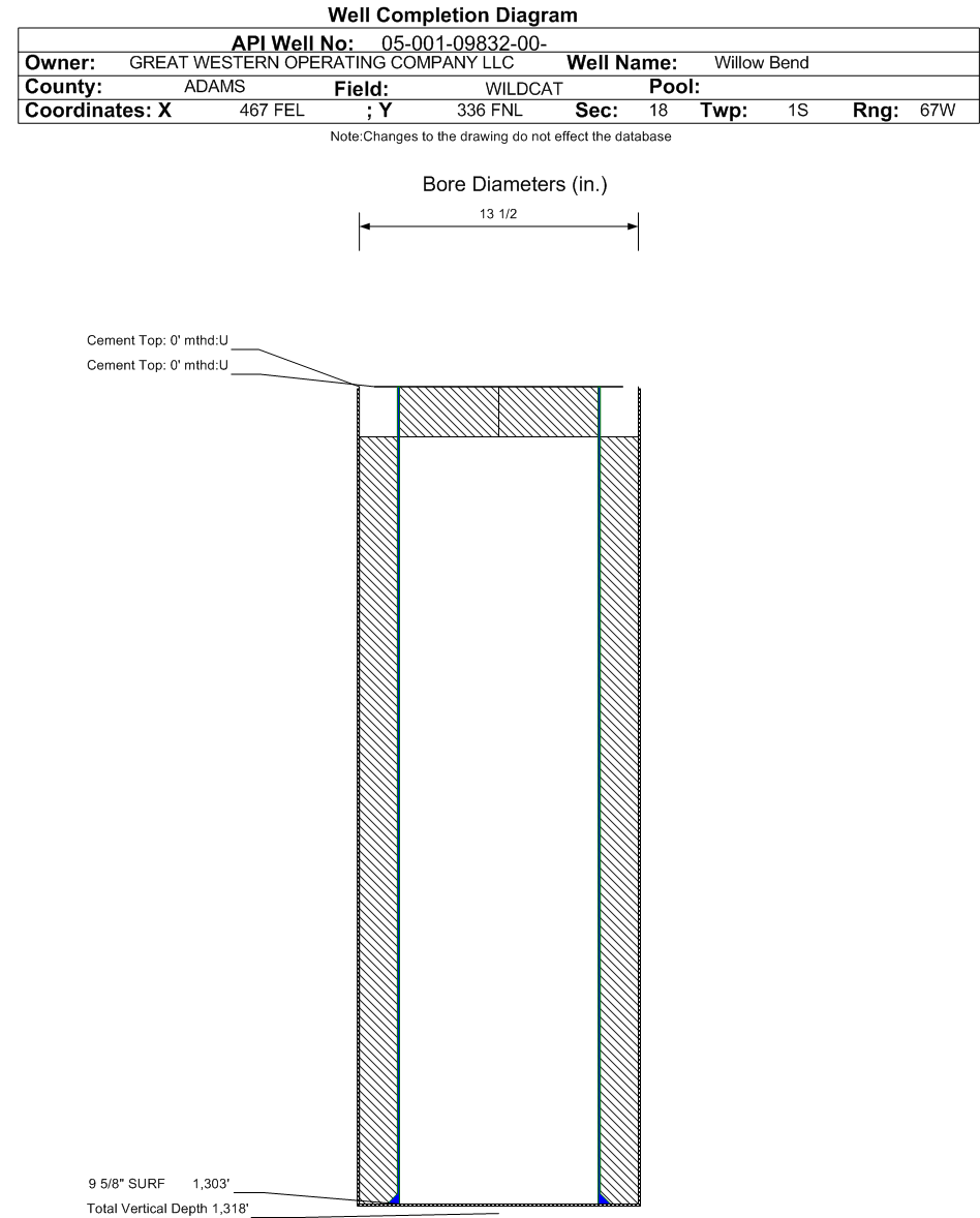 Wellbore #00 Wellbore Classification: LO Status: PA - 7/2/2019 Measured TD: 1318 ft. Vertical TD: 1318 ft.| Wellbore Data for Original Wellbore | Wellbore Classification: LO PA - 7/2/2019 | | Wellbore Permit | HORIZONTAL | | Permit #: | | Expiration Date: | 11/4/2016 | | Proposed Top PZ Location: | Sec:18 Twp: 1S 67W | Footage: 460 FNL 86 FEL | | Bottom Hole Location: | Sec:18 Twp: 1S 67W | Footage: 470 FSL 86 FEL | | Proposed Depth/Form: | 12516 ft. | | Surface Mineral Owner Same: | No | | Mineral Owner: | FEE | Surface Owner: | FEE | | Unit: | | Unit Number: | | | Formation And Spacing: | Code: NBRR , Formation: NIOBRARA , Order: , Unit Acreage: 320, Drill Unit: GWA | | Casing: | String Type: CONDUCTOR, Hole Size: 24 in., Size: 16 in., Top: 0 ft., Depth: 80 ft., Weight: 42 , Citings Type: PLANNED | | Cement: | Sacks: 121, Top: 0 ft., Bottom: 80 ft. | | Casing: | String Type: SURF, Hole Size: 13.5 in., Size: 9.625 in., Top: 0 ft., Depth: 1300 ft., Weight: 36 , Citings Type: PLANNED | | Cement: | Sacks: 579, Top: 0 ft., Bottom: 1300 ft. | | Casing: | String Type: 1ST, Hole Size: 8.75 in., Size: 7 in., Top: 0 ft., Depth: 8154 ft., Weight: 26 , Citings Type: PLANNED | | Cement: | Sacks: 695, Top: 1000 ft., Bottom: 8154 ft. | | Casing: | String Type: 1ST LINER, Hole Size: 6.125 in., Size: 4.5 in., Top: 7267 ft., Depth: 12483 ft., Weight: 11.6 , Citings Type: PLANNED | | Cement: | Sacks: 323, Top: 7267 ft., Bottom: 12483 ft. |