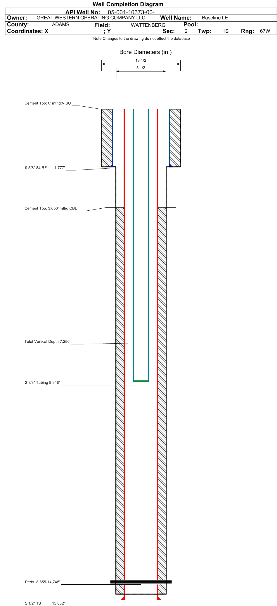 | Wellbore Completed | | Completion Date: | 7/15/2019 | | Spud Date: | 6/17/2019 | Spud Date Is: | ACTUAL | | Measured TD: | 15032 ft. | Measured PB depth: | 15023 ft. | | True Vertical TD: | 7250 ft. | True Vertical PB depth: | 7251 ft. | | Top PZ Location: | Sec:1 Twp: 1S 67W | Footage: 735 FSL 528 FWL | | Bottom Hole Location: | Sec:6 Twp: 1S 66W | Footage: 762 FSL 1369 FWL | | Log Types: | Mud Log, MWD/LWD, CBL (Composite in 001-10365) | | Casing: | String Type: SURF, Hole Size: 13.5 in., Size: 9.625 in., Top: 0 ft., Depth: 1777 ft., Weight: 36 , Citings Type: ACTUAL | | Cement: | Sacks: 800, Top: 0 ft., Bottom: 1777 ft., Determination Method: VISU | | Casing: | String Type: 1ST, Hole Size: 8.5 in., Size: 5.5 in., Top: 0 ft., Depth: 15032 ft., Weight: 17 , Citings Type: ACTUAL | | Cement: | Sacks: 2005, Top: 3050 ft., Bottom: 15032 ft., Determination Method: CBL | | Formation | Interval Top | Log Bottom | Cored | DSTs | | PARKMAN | 4889 ft. | 5050 ft. | N | N | | SUSSEX | 5304 ft. | 5524 ft. | N | N | | SHANNON | 5946 ft. | 6071 ft. | N | N | | SHARON SPRINGS | 8499 ft. | | N | N | | NIOBRARA | 8597 ft. | | N | N |