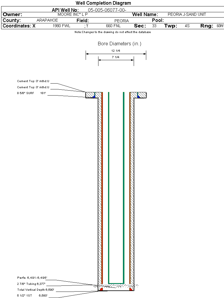 | Wellbore Completed | | Completion Date: | 12/2/1970 | | Spud Date: | 8/5/1970 | Spud Date Is: | ACTUAL | | Measured TD: | 6590 ft. | Measured PB depth: | 6554 ft. | | True Vertical TD: | | True Vertical PB depth: | | | Log Types: | GR DENSITY, IES | | Casing: | String Type: SURF, Hole Size: 12.25 in., Size: 8.625 in., Top: , Depth: 181 ft., Weight: 24 , Citings Type: ACTUAL | | Cement: | Sacks: 150, Top: , Bottom: , Determination Method: | | Casing: | String Type: 1ST, Hole Size: 7.25 in., Size: 5.5 in., Top: , Depth: 6580 ft., Weight: 14 , Citings Type: ACTUAL | | Cement: | Sacks: 200, Top: , Bottom: , Determination Method: | | Formation | Interval Top | Log Bottom | Cored | DSTs | | D SAND | 6390 ft. | | N | N | | J SAND | 6430 ft. | | N | N |