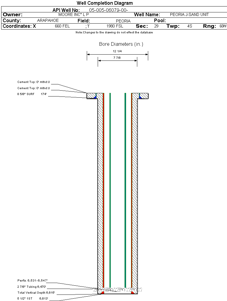 Wellbore #00 Wellbore Classification: ERIW Status: PA - 3/9/1994 Measured TD: 6615 ft.| Wellbore Data for Original Wellbore | Wellbore Classification: ERIW PA - 3/9/1994 | | Wellbore Permit | | | Permit #: | 19700377 | Expiration Date: | 8/10/1971 | | Proposed Depth/Form: | 6535 ft. | | Surface Mineral Owner Same: | Not available | | Mineral Owner: | FEE | Surface Owner: | FEE | | Unit: | | Unit Number: | | | Formation And Spacing: | Code: MDDYJ , Formation: MUDDY J , Order: , Unit Acreage: 80, Drill Unit: NESE |