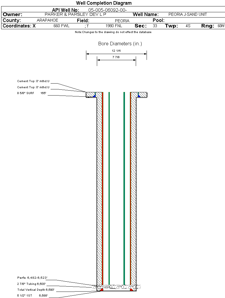 | Wellbore Completed | | Completion Date: | 9/25/1970 | | Spud Date: | 9/9/1970 | Spud Date Is: | ACTUAL | | Measured TD: | 6590 ft. | Measured PB depth: | 6546 ft. | | True Vertical TD: | | True Vertical PB depth: | | | Log Types: | IES, FDC DENSITY GR CALIPER | | Casing: | String Type: SURF, Hole Size: 12.25 in., Size: 8.625 in., Top: , Depth: 165 ft., Weight: 24 , Citings Type: ACTUAL | | Cement: | Sacks: 150, Top: , Bottom: , Determination Method: | | Casing: | String Type: 1ST, Hole Size: 7.875 in., Size: 5.5 in., Top: , Depth: 6588 ft., Weight: 14&15.5 , Citings Type: ACTUAL | | Cement: | Sacks: 200, Top: , Bottom: , Determination Method: | | Formation | Interval Top | Log Bottom | Cored | DSTs | | D SAND | 6402 ft. | | N | N | | J SAND | 6443 ft. | | N | N |