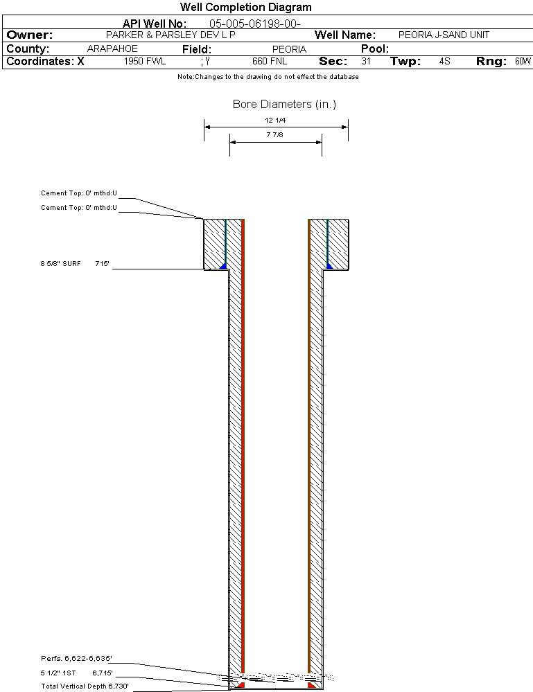 | Wellbore Completed | | Completion Date: | 2/17/1971 | | Spud Date: | 2/1/1971 | Spud Date Is: | ACTUAL | | Measured TD: | 6730 ft. | Measured PB depth: | | | True Vertical TD: | | True Vertical PB depth: | | | Log Types: | IES X COMP DENSITY LOG | | Casing: | String Type: SURF, Hole Size: 12.25 in., Size: 8.625 in., Top: , Depth: 715 ft., Weight: 24 , Citings Type: ACTUAL | | Cement: | Sacks: 550, Top: , Bottom: , Determination Method: | | Casing: | String Type: 1ST, Hole Size: 7.875 in., Size: 5.5 in., Top: , Depth: 6715 ft., Weight: 14&15.5 , Citings Type: ACTUAL | | Cement: | Sacks: 200, Top: , Bottom: , Determination Method: | | Formation | Interval Top | Log Bottom | Cored | DSTs | | D SAND | 6547 ft. | | N | N | | J SAND | 6593 ft. | | N | N |