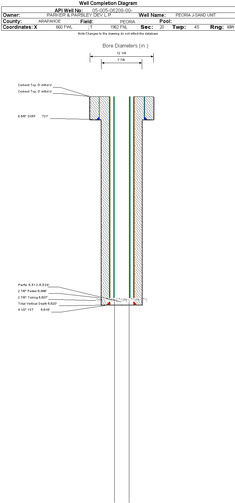 | Wellbore Completed | | Completion Date: | 3/20/1971 | | Spud Date: | 2/19/1971 | Spud Date Is: | ACTUAL | | Measured TD: | 6620 ft. | Measured PB depth: | | | True Vertical TD: | | True Vertical PB depth: | | | Log Types: | INDUCTION-ELECTRICAL, SONIC-GAMMA RAY | | Casing: | String Type: SURF, Hole Size: 12.25 in., Size: 8.625 in., Top: , Depth: 721 ft., Weight: 24 , Citings Type: ACTUAL | | Cement: | Sacks: 450, Top: , Bottom: , Determination Method: | | Casing: | String Type: 1ST, Hole Size: 7.875 in., Size: 4.5 in., Top: , Depth: 6618 ft., Weight: 9.5 , Citings Type: ACTUAL | | Cement: | Sacks: 250, Top: , Bottom: , Determination Method: | | Formation | Interval Top | Log Bottom | Cored | DSTs | | NIOBRARA | 5640 ft. | | N | N | | FORT HAYS | 5993 ft. | | N | N | | CARLILE | 6029 ft. | | N | N | | GREENHORN | 6112 ft. | | N | N | | BENTONITE | 6334 ft. | | N | N | | D SAND | 6430 ft. | | N | N | | J SAND | 6478 ft. | | N | N |