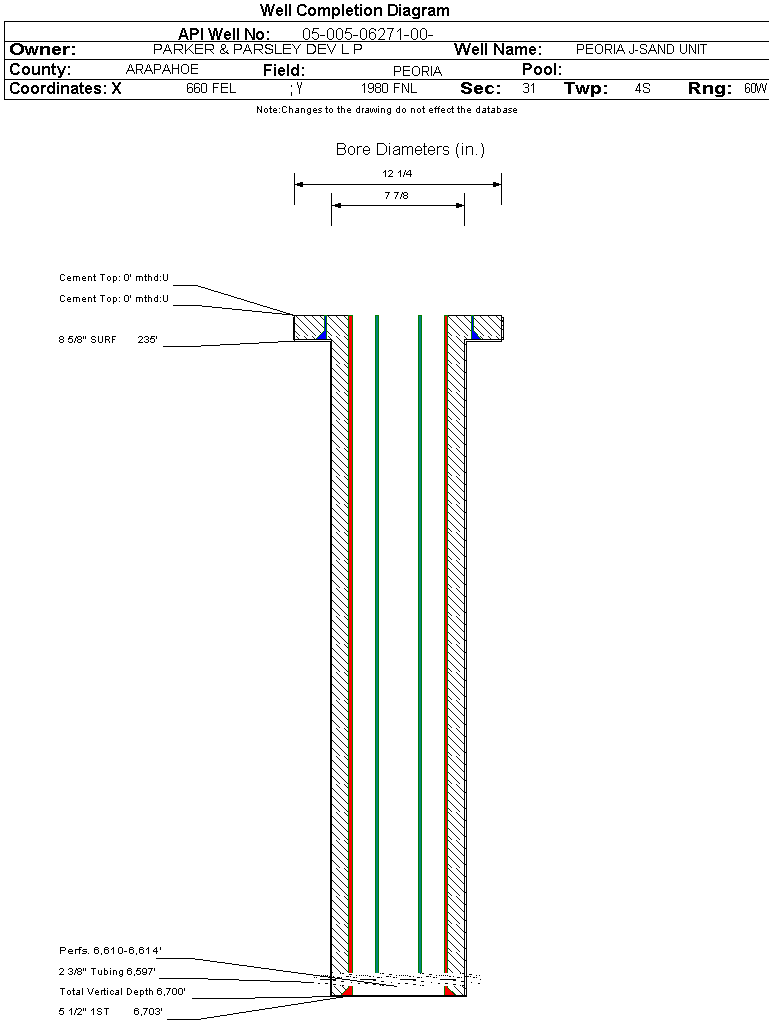 | Wellbore Completed | | Completion Date: | 10/28/1971 | | Spud Date: | 9/11/1971 | Spud Date Is: | ACTUAL | | Measured TD: | 6700 ft. | Measured PB depth: | 6668 ft. | | True Vertical TD: | | True Vertical PB depth: | | | Log Types: | I-ES, FDC-GAMMA RAY | | Casing: | String Type: SURF, Hole Size: 12.25 in., Size: 8.625 in., Top: , Depth: 235 ft., Weight: 20 , Citings Type: ACTUAL | | Cement: | Sacks: 150, Top: , Bottom: , Determination Method: | | Casing: | String Type: 1ST, Hole Size: 7.875 in., Size: 5.5 in., Top: , Depth: 6703 ft., Weight: 15.5 , Citings Type: ACTUAL | | Cement: | Sacks: 285, Top: , Bottom: , Determination Method: | | Formation | Interval Top | Log Bottom | Cored | DSTs | | NIOBRARA | 5726 ft. | | | | | CARLILE | 6126 ft. | | | | | GREENHORN | 6205 ft. | | | | | BENTONITE | 6426 ft. | | | | | D SAND | 6525 ft. | | | | | J SAND | 6576 ft. | | Y | Y | | SKULL CREEK | 6708 ft. | | | |