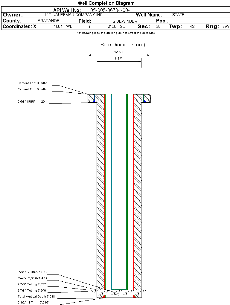 | Wellbore Completed | | Completion Date: | 9/5/1984 | | Spud Date: | 9/23/1976 | Spud Date Is: | ACTUAL | | Measured TD: | 7518 ft. | Measured PB depth: | 7331 ft. | | True Vertical TD: | 0 ft. | True Vertical PB depth: | | | Log Types: | INDUCTION ELEC. LOG BOREHOLE COMPENSATED SONIC LOG | | Casing: | String Type: SURF, Hole Size: 12.25 in., Size: 9.625 in., Top: 0 ft., Depth: 294 ft., Weight: 40 , Citings Type: ACTUAL | | Cement: | Sacks: 200, Top: 0 ft., Bottom: , Determination Method: | | Casing: | String Type: 1ST, Hole Size: 8.75 in., Size: 5.5 in., Top: 0 ft., Depth: 7515 ft., Weight: 15.5 , Citings Type: ACTUAL | | Cement: | Sacks: 550, Top: 0 ft., Bottom: , Determination Method: | | Formation | Interval Top | Log Bottom | Cored | DSTs | | NIOBRARA | 6566 ft. | | | | | FORT HAYS | 6900 ft. | | | | | CARLILE | 6934 ft. | | | | | GREENHORN | 7007 ft. | | | | | GRANEROS | 7062 ft. | | | | | BENTONITE | 7223 ft. | | | | | D SAND | 7315 ft. | | | | | J SAND | 7366 ft. | | | | | SKULL CREEK | 7509 ft. | | | |