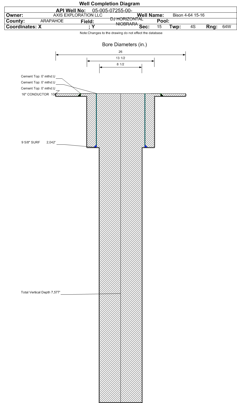 | Wellbore Completed | | Completion Date: | 10/29/2016 | | Spud Date: | 10/28/2016 | Spud Date Is: | ACTUAL | | Measured TD: | 11703 ft. | Measured PB depth: | 2042 ft. | | True Vertical TD: | 7577 ft. | True Vertical PB depth: | 2042 ft. | | Bottom Hole Location: | Sec:16 Twp: 4S 64W | Footage: 691 FNL 1670 FEL | | Log Types: | DEN, NEU, MUD | | Casing: | String Type: CONDUCTOR, Hole Size: 26 in., Size: 16 in., Top: 0 ft., Depth: 100 ft., Weight: 42 , Citings Type: ACTUAL | | Cement: | Sacks: 80, Top: 0 ft., Bottom: 100 ft., Determination Method: VISU | | Casing: | String Type: SURF, Hole Size: 13.5 in., Size: 9.625 in., Top: 0 ft., Depth: 2042 ft., Weight: 36 , Citings Type: ACTUAL | | Cement: | Sacks: 680, Top: 0 ft., Bottom: 2042 ft., Determination Method: VISU | | Casing: | String Type: OPEN HOLE, Hole Size: 8.5 in., Size: , Top: 2042 ft., Depth: 11703 ft., Weight: , Citings Type: ACTUAL | | Cement: | Sacks: , Top: , Bottom: , Determination Method: | | Formation | Interval Top | Log Bottom | Cored | DSTs | | FOX HILLS | 1632 ft. | | N | N | | PIERRE | 1802 ft. | | N | N | | SHARON SPRINGS | 7342 ft. | | N | N | | NIOBRARA | 7415 ft. | | N | N | | No formation data to display. |