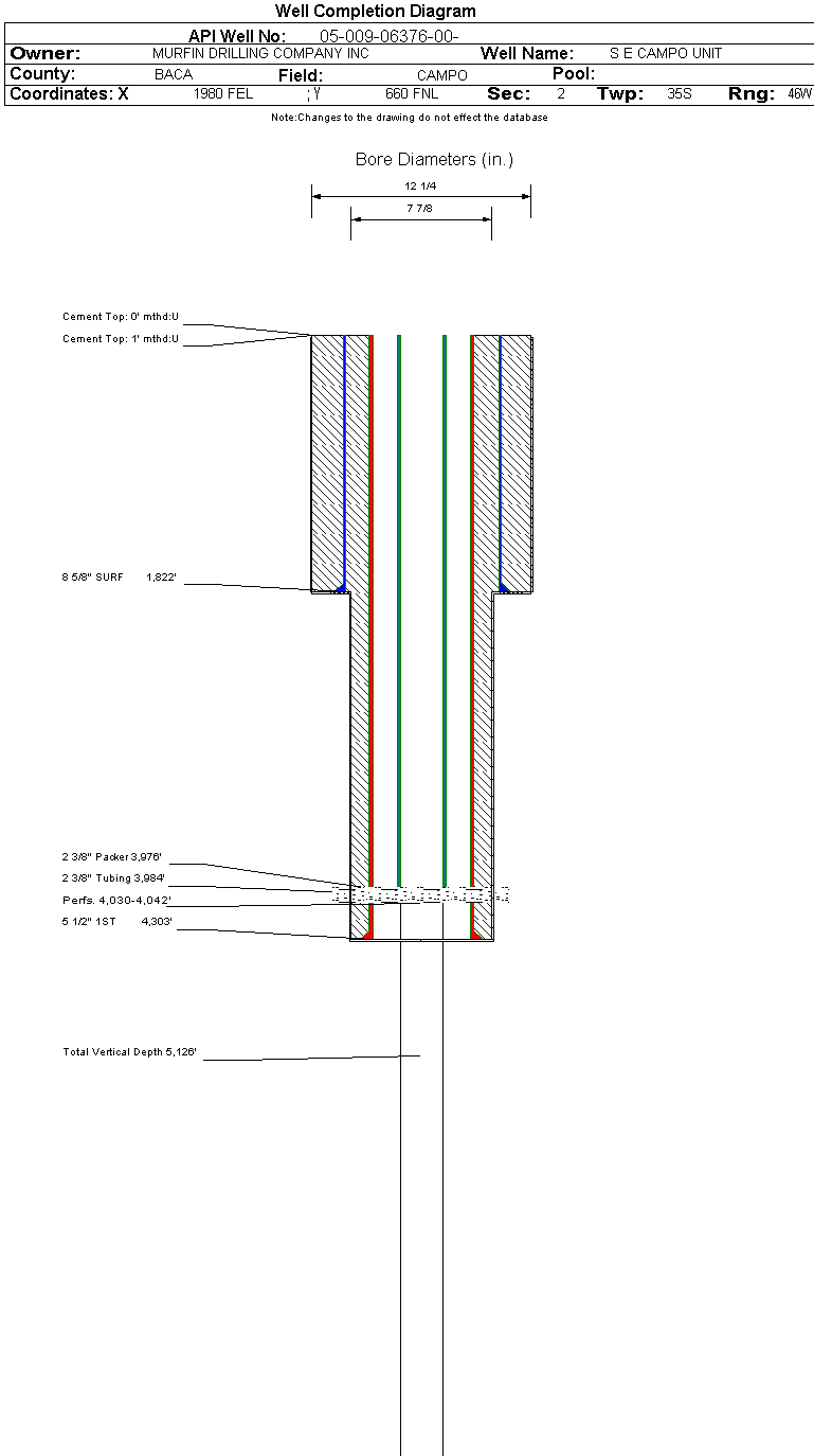 | | Perforation Data: | | Interval Top: | 4030 ft. | # Of Holes: | 48 | | Interval Bottom: | 4042 ft. | Hole Size: | 0.5 in. |