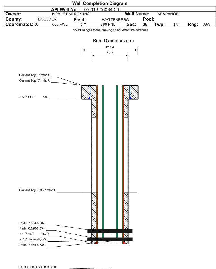 | | Perforation Data: | | Interval Top: | 7664 ft. | # Of Holes: | 39 | | Interval Bottom: | 8534 ft. | Hole Size: | 0.37 in. |