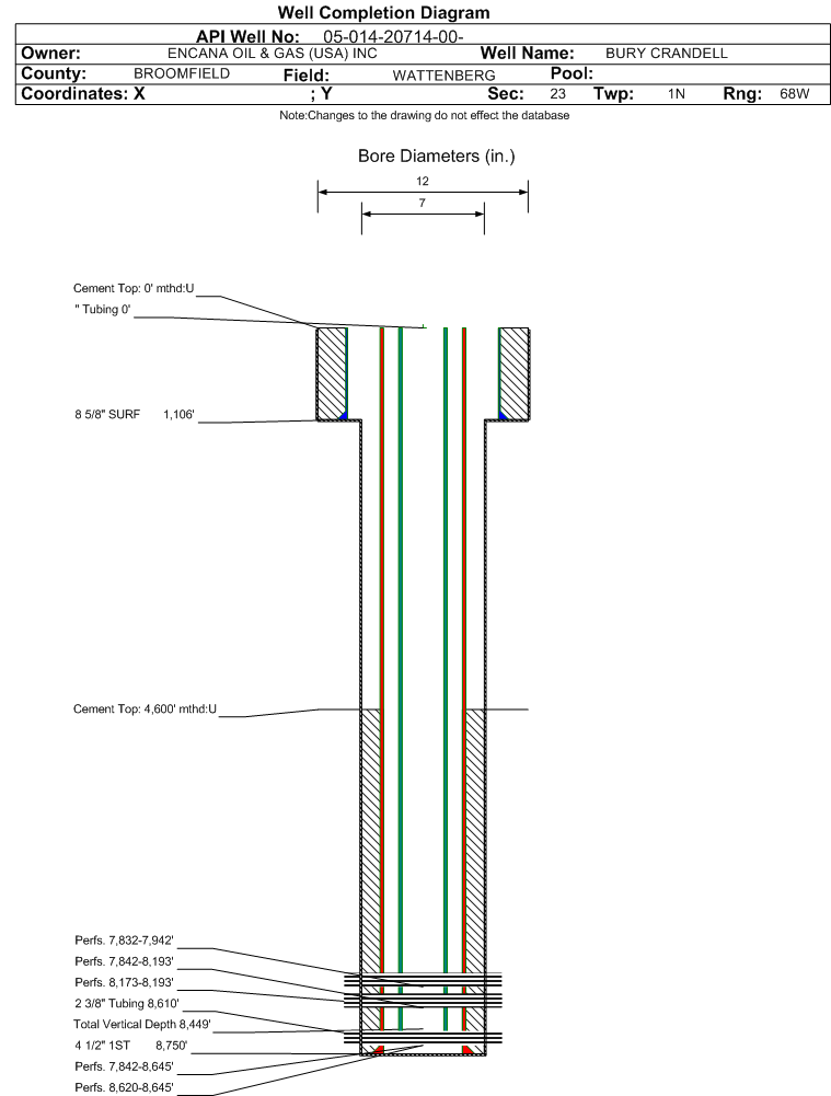 Formation CODL Formation Classification: GW Status: CM - 4/18/2022 Interval Top: 8173 ft. Interval Bottom: 8193 ft.| Completed Information for Formation CODELL | | 1st Production Date: | 4/9/2012 | Choke Size: | | | Formation Name: | CODELL | Commingled: | Yes | | Production Method: | | | Open Hole Completion: | No |