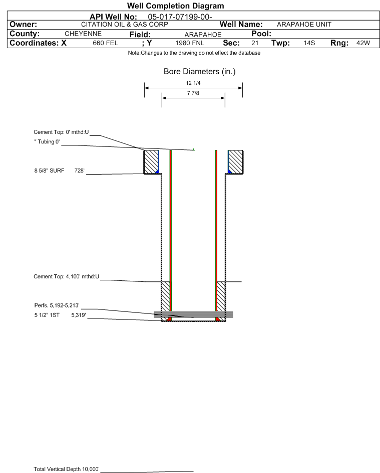 | | Perforation Data: | | Interval Top: | 5192 ft. | # Of Holes: | 60 | | Interval Bottom: | 5213 ft. | Hole Size: | |