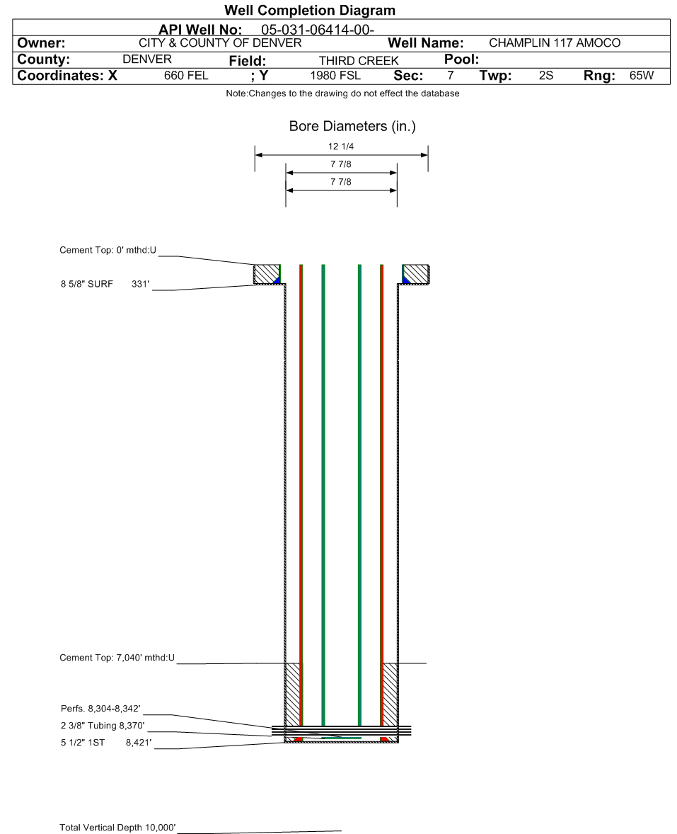| Wellbore Completed | | Completion Date: | 6/5/1972 | | Spud Date: | 1/11/1972 | Spud Date Is: | ACTUAL | | Measured TD: | 8425 ft. | Measured PB depth: | 8369 ft. | | True Vertical TD: | | True Vertical PB depth: | | | Log Types: | IES, GR | | Casing: | String Type: SURF, Hole Size: 12.25 in., Size: 8.625 in., Top: 0 ft., Depth: 331 ft., Weight: 24# , Citings Type: ACTUAL | | Cement: | Sacks: 325, Top: 0 ft., Bottom: 331 ft., Determination Method: VISU | | Casing: | String Type: 1ST, Hole Size: 7.875 in., Size: 5.5 in., Top: 0 ft., Depth: 8421 ft., Weight: 15.5 # , Citings Type: ACTUAL | | Cement: | Sacks: 300, Top: 7040 ft., Bottom: 8421 ft., Determination Method: CBL | | Casing: | String Type: STAGE TOOL, Hole Size: 7.875 in., Size: 5.5 in., Top: , Depth: 1678 ft., Weight: 15.5 # , Citings Type: ACTUAL | | Cement: | Sacks: 300, Top: 560 ft., Bottom: 1710 ft., Determination Method: CBL | | Formation | Interval Top | Log Bottom | Cored | DSTs | | D SAND | 8252 ft. | | | | | J SAND | 8302 ft. | | | |