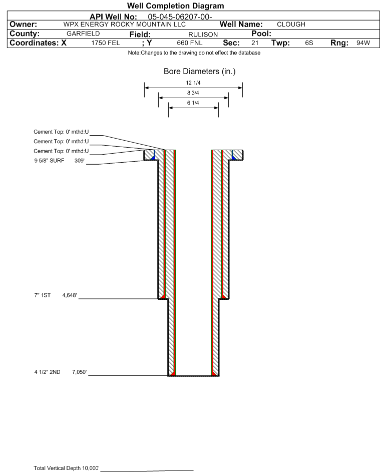 | Wellbore Completed | | Completion Date: | 2/6/1995 | | Measured TD: | 7050 ft. | Measured PB depth: | 5825 ft. | | True Vertical TD: | 0 ft. | True Vertical PB depth: | | | Casing: | String Type: SURF, Hole Size: 12.25 in., Size: 9.625 in., Top: 0 ft., Depth: 309 ft., Weight: , Citings Type: HISTORICAL | | Cement: | Sacks: 200, Top: 0 ft., Bottom: , Determination Method: | | Casing: | String Type: 1ST, Hole Size: 8.75 in., Size: 7 in., Top: 0 ft., Depth: 4648 ft., Weight: , Citings Type: HISTORICAL | | Cement: | Sacks: 0, Top: 0 ft., Bottom: , Determination Method: | | Casing: | String Type: 2ND, Hole Size: 6.25 in., Size: 4.5 in., Top: 0 ft., Depth: 7050 ft., Weight: , Citings Type: HISTORICAL | | Cement: | Sacks: 0, Top: 0 ft., Bottom: , Determination Method: | | Formation | Interval Top | Log Bottom | Cored | DSTs | | MESAVERDE | 4230 ft. | | | | | CAMEO COAL | 6993 ft. | | | |