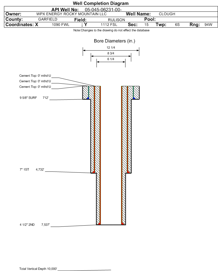 Wellbore #00 Wellbore Classification: GW Status: PA - 11/21/2023 Measured TD: 7571 ft. Vertical TD: 0 ft.| Wellbore Data for Original Wellbore | Wellbore Classification: GW PA - 11/21/2023 | | Wellbore Permit | | | Permit #: | 791217 | Expiration Date: | 7/3/1980 | | Proposed Depth/Form: | | | Surface Mineral Owner Same: | Not available | | Mineral Owner: | FEE | Surface Owner: | Not available | | Unit: | | Unit Number: | | | Formation And Spacing: | Code: WMFK , Formation: WILLIAMS FORK , Order: 0 , Unit Acreage: 157, Drill Unit: |