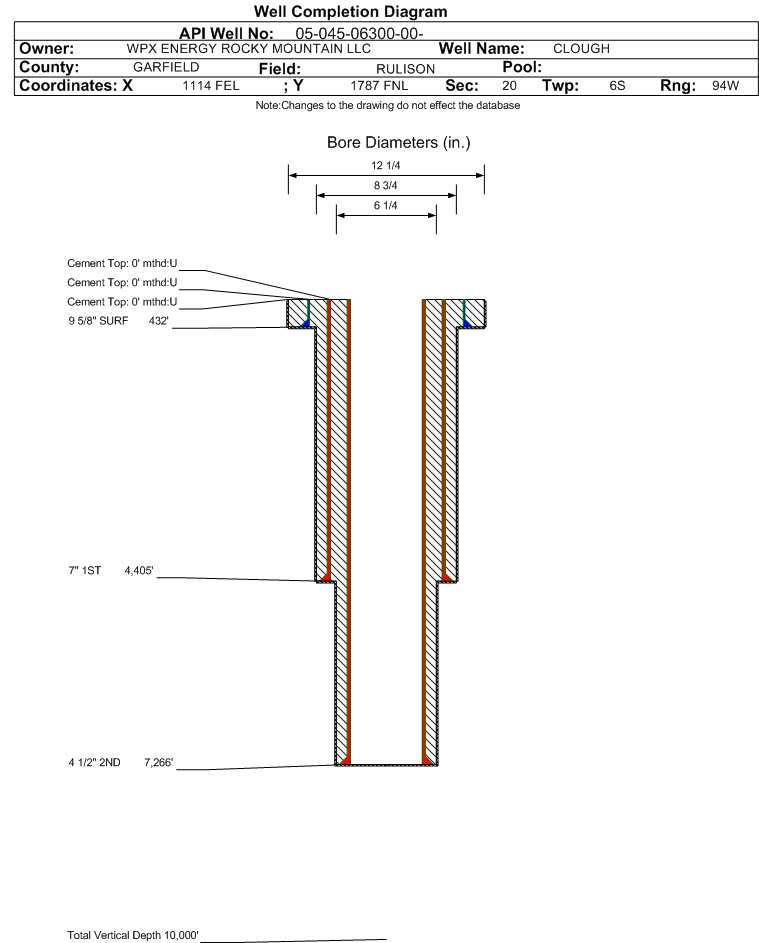 | Wellbore Completed | | Completion Date: | 2/24/1995 | | Measured TD: | 7265 ft. | Measured PB depth: | 0 ft. | | True Vertical TD: | 0 ft. | True Vertical PB depth: | | | Casing: | String Type: SURF, Hole Size: 12.25 in., Size: 9.625 in., Top: 0 ft., Depth: 432 ft., Weight: , Citings Type: HISTORICAL | | Cement: | Sacks: 160, Top: 0 ft., Bottom: , Determination Method: | | Casing: | String Type: 1ST, Hole Size: 8.75 in., Size: 7 in., Top: 0 ft., Depth: 4405 ft., Weight: , Citings Type: HISTORICAL | | Cement: | Sacks: 0, Top: 0 ft., Bottom: , Determination Method: | | Casing: | String Type: 2ND, Hole Size: 6.25 in., Size: 4.5 in., Top: 0 ft., Depth: 7266 ft., Weight: , Citings Type: HISTORICAL | | Cement: | Sacks: 0, Top: 0 ft., Bottom: , Determination Method: | | Formation | Interval Top | Log Bottom | Cored | DSTs | | MESAVERDE | 4253 ft. | | | | | CAMEO COAL | 6948 ft. | | | |
