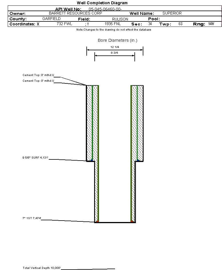 | Wellbore Completed | | Completion Date: | 12/15/1993 | | Measured TD: | 7564 ft. | Measured PB depth: | 0 ft. | | True Vertical TD: | 0 ft. | True Vertical PB depth: | | | Casing: | String Type: SURF, Hole Size: 12.25 in., Size: 9.625 in., Top: 0 ft., Depth: 4131 ft., Weight: , Citings Type: HISTORICAL | | Cement: | Sacks: 1400, Top: 0 ft., Bottom: , Determination Method: | | Casing: | String Type: 1ST, Hole Size: 8.75 in., Size: 7 in., Top: 0 ft., Depth: 7474 ft., Weight: , Citings Type: HISTORICAL | | Cement: | Sacks: 0, Top: 0 ft., Bottom: , Determination Method: | | Formation | Interval Top | Log Bottom | Cored | DSTs | | FORT UNION | 3242 ft. | | | | | MESAVERDE | 3907 ft. | | | |