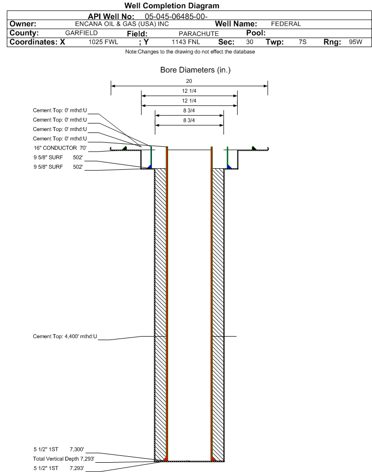| Wellbore Completed | | Completion Date: | 1/14/1985 | | Spud Date: | 12/12/1984 | Spud Date Is: | ACTUAL | | Measured TD: | 7293 ft. | Measured PB depth: | 0 ft. | | True Vertical TD: | 7293 ft. | True Vertical PB depth: | | | Casing: | String Type: CONDUCTOR, Hole Size: , Size: , Top: , Depth: 70 ft., Weight: 65 , Citings Type: ACTUAL | | Cement: | Sacks: 70, Top: 0 ft., Bottom: 70 ft., Determination Method: VISU | | Casing: | String Type: CONDUCTOR, Hole Size: 20 in., Size: 16 in., Top: 0 ft., Depth: 70 ft., Weight: , Citings Type: HISTORICAL | | Cement: | Sacks: 0, Top: 0 ft., Bottom: , Determination Method: | | Casing: | String Type: SURF, Hole Size: 12.25 in., Size: 9.625 in., Top: , Depth: 502 ft., Weight: 36 , Citings Type: ACTUAL | | Cement: | Sacks: 300, Top: 0 ft., Bottom: 502 ft., Determination Method: VISU | | Casing: | String Type: SURF, Hole Size: 12.25 in., Size: 9.625 in., Top: 0 ft., Depth: 502 ft., Weight: , Citings Type: HISTORICAL | | Cement: | Sacks: 0, Top: 0 ft., Bottom: , Determination Method: | | Casing: | String Type: 1ST, Hole Size: 8.75 in., Size: 5.5 in., Top: , Depth: 7293 ft., Weight: 15.5 , Citings Type: ACTUAL | | Cement: | Sacks: 1180, Top: 4400 ft., Bottom: 7293 ft., Determination Method: CALC | | Casing: | String Type: 1ST, Hole Size: 8.75 in., Size: 5.5 in., Top: 0 ft., Depth: 7300 ft., Weight: , Citings Type: HISTORICAL | | Cement: | Sacks: 0, Top: 0 ft., Bottom: , Determination Method: | | Formation | Interval Top | Log Bottom | Cored | DSTs | | MESAVERDE | 3658 ft. | | | | | COZZETTE | 6778 ft. | | | |
