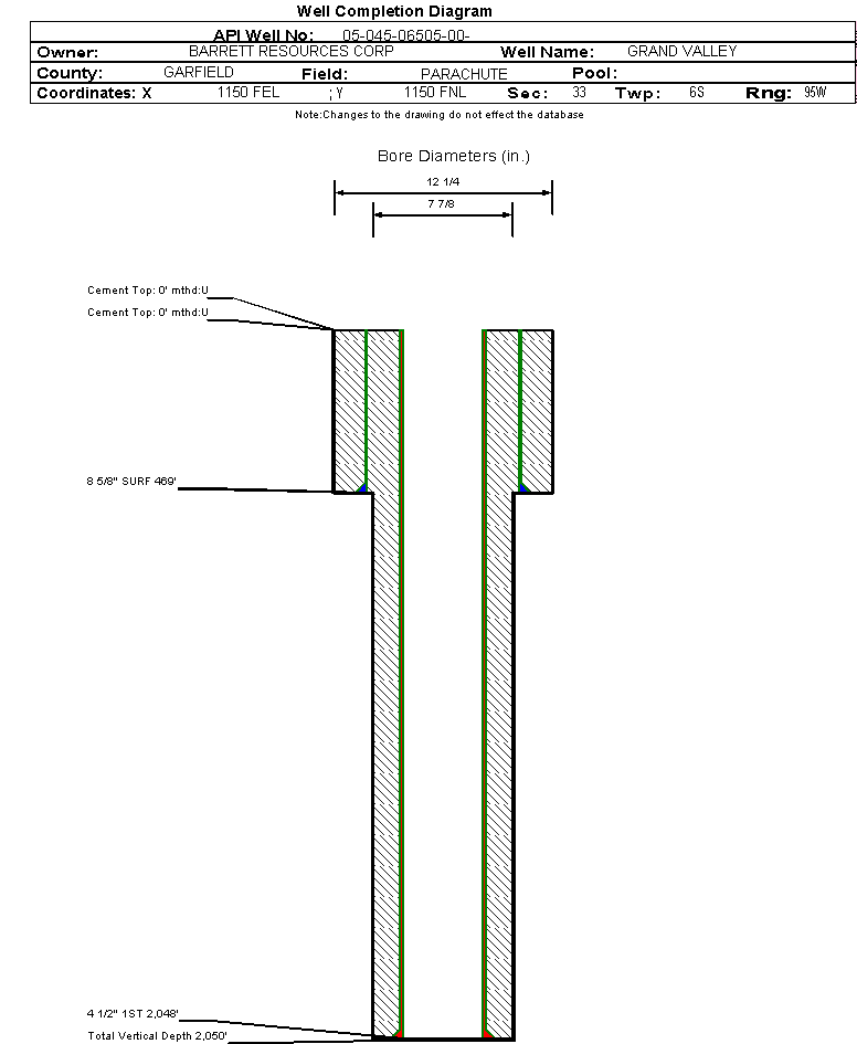 | Wellbore Completed | | Completion Date: | 5/26/1985 | | Measured TD: | 2050 ft. | Measured PB depth: | 1950 ft. | | True Vertical TD: | 2050 ft. | True Vertical PB depth: | | | Casing: | String Type: SURF, Hole Size: 12.25 in., Size: 8.625 in., Top: 0 ft., Depth: 469 ft., Weight: , Citings Type: HISTORICAL | | Cement: | Sacks: 0, Top: 0 ft., Bottom: , Determination Method: | | Casing: | String Type: 1ST, Hole Size: 7.875 in., Size: 4.5 in., Top: 0 ft., Depth: 2048 ft., Weight: , Citings Type: HISTORICAL | | Cement: | Sacks: 0, Top: 0 ft., Bottom: , Determination Method: | | Formation | Interval Top | Log Bottom | Cored | DSTs | | WASATCH | 0 ft. | | | |