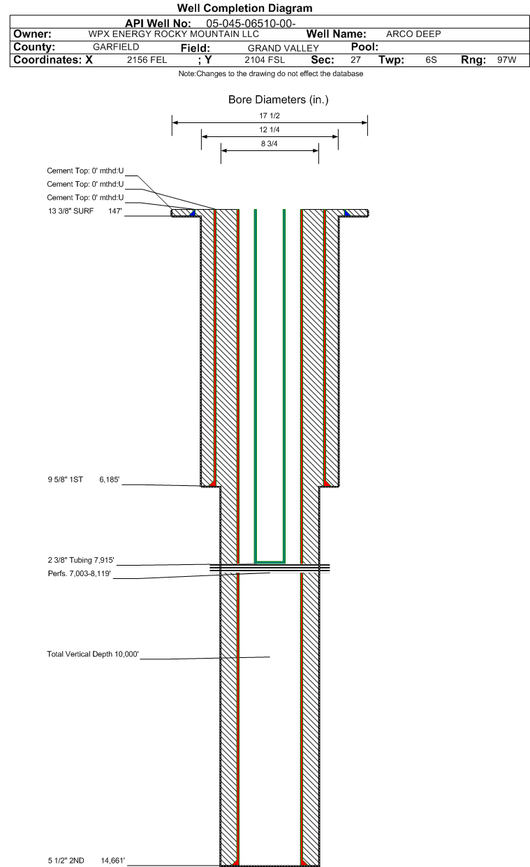| Wellbore Completed | | Completion Date: | 8/15/1987 | | Measured TD: | 15531 ft. | Measured PB depth: | 14409 ft. | | True Vertical TD: | 0 ft. | True Vertical PB depth: | | | Top PZ Location: | Sec: Twp: | Footage: 0 FL 0 FL | | Casing: | String Type: SURF, Hole Size: 17.5 in., Size: 13.375 in., Top: 1 ft., Depth: 147 ft., Weight: 48 , Citings Type: ACTUAL | | Cement: | Sacks: 185, Top: 1 ft., Bottom: 147 ft., Determination Method: CALC | | Casing: | String Type: 1ST, Hole Size: 12.25 in., Size: 9.625 in., Top: 1 ft., Depth: 6185 ft., Weight: 40 , Citings Type: ACTUAL | | Cement: | Sacks: 1200, Top: 1 ft., Bottom: 6185 ft., Determination Method: CALC | | Casing: | String Type: 2ND, Hole Size: 8.75 in., Size: 5.5 in., Top: 1 ft., Depth: 14661 ft., Weight: 17 , Citings Type: ACTUAL | | Cement: | Sacks: 3135, Top: 1 ft., Bottom: 14661 ft., Determination Method: CALC | | Formation | Interval Top | Log Bottom | Cored | DSTs | | CRETACEOUS | 5434 ft. | | | | | CAMEO | 8147 ft. | | | | | ROLLINS | 8460 ft. | | | | | COZZETTE | 8680 ft. | | | | | CORCORAN | 8963 ft. | | | | | MANCOS | 9216 ft. | | | | | NIOBRARA | 11900 ft. | | | | | FRONTIER | 13060 ft. | | | | | MOWRY | 13095 ft. | | | | | MORRISON | 13598 ft. | | | | | ENTRADA | 14102 ft. | | | | | CHINLE | 14335 ft. | | | |