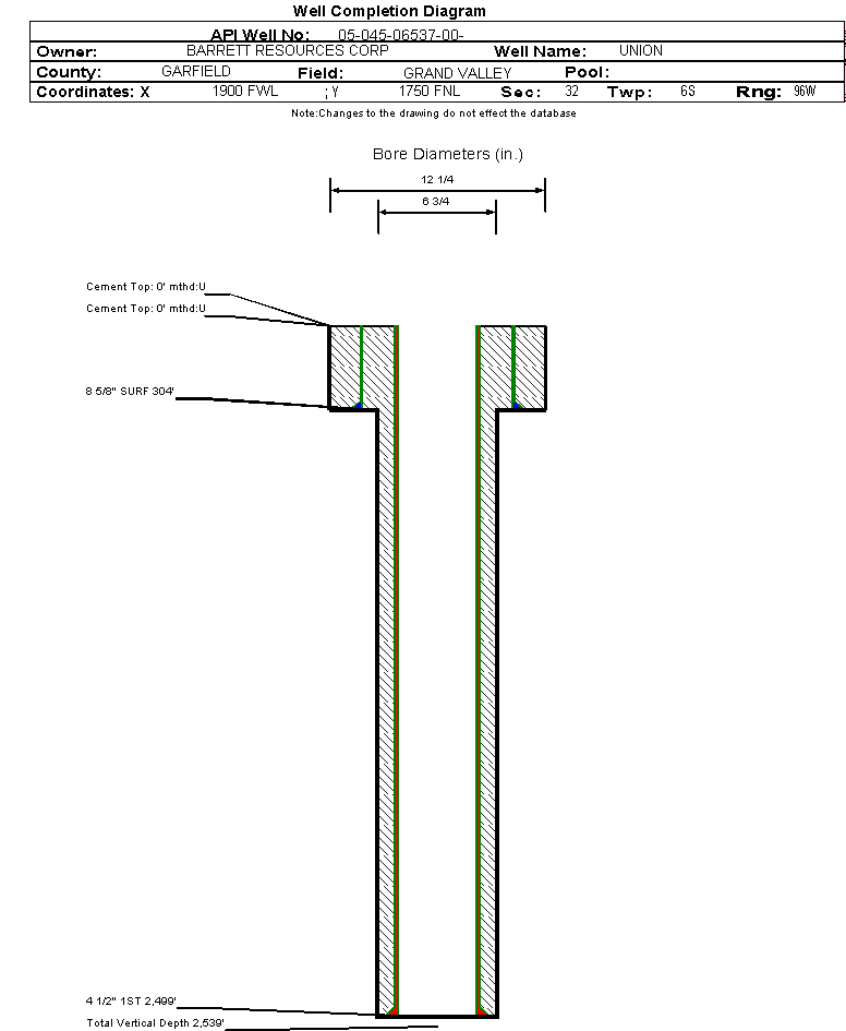 | Wellbore Completed | | Completion Date: | 7/29/1987 | | Measured TD: | 2539 ft. | Measured PB depth: | 2348 ft. | | True Vertical TD: | 2539 ft. | True Vertical PB depth: | | | Casing: | String Type: SURF, Hole Size: 12.25 in., Size: 8.625 in., Top: 0 ft., Depth: 304 ft., Weight: 23 , Citings Type: ACTUAL | | Cement: | Sacks: 175, Top: 0 ft., Bottom: 304 ft., Determination Method: VISU | | Casing: | String Type: 1ST, Hole Size: 6.75 in., Size: 4.5 in., Top: 0 ft., Depth: 2499 ft., Weight: 10.5 , Citings Type: ACTUAL | | Cement: | Sacks: 375, Top: , Bottom: 2499 ft., Determination Method: | | Formation | Interval Top | Log Bottom | Cored | DSTs | | WASATCH | 0 ft. | | | |