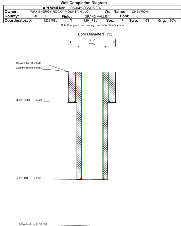 | Wellbore Completed | | Completion Date: | 11/22/1988 | | Spud Date: | 6/23/1988 | Spud Date Is: | ACTUAL | | Measured TD: | 7025 ft. | Measured PB depth: | 6989 ft. | | True Vertical TD: | 0 ft. | True Vertical PB depth: | | | Casing: | String Type: SURF, Hole Size: 12.25 in., Size: 8.625 in., Top: 0 ft., Depth: 2006 ft., Weight: , Citings Type: HISTORICAL | | Cement: | Sacks: 935, Top: 0 ft., Bottom: , Determination Method: | | Casing: | String Type: 1ST, Hole Size: 7.875 in., Size: 5.5 in., Top: 0 ft., Depth: 7024 ft., Weight: , Citings Type: HISTORICAL | | Cement: | Sacks: 0, Top: 0 ft., Bottom: , Determination Method: | | Formation | Interval Top | Log Bottom | Cored | DSTs | | WASATCH | 0 ft. | | | | | FORT UNION | 2390 ft. | | | | | MESAVERDE | 3790 ft. | | | | | CAMEO | 6472 ft. | | | | | ROLLINS | 6934 ft. | | | |