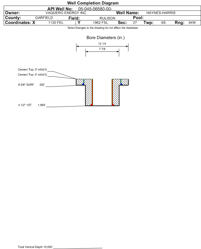 | Wellbore Completed | | Completion Date: | 3/29/1990 | | Measured TD: | 1576 ft. | Measured PB depth: | 1457 ft. | | True Vertical TD: | 0 ft. | True Vertical PB depth: | | | Casing: | String Type: SURF, Hole Size: 12.25 in., Size: 8.625 in., Top: 0 ft., Depth: 352 ft., Weight: , Citings Type: HISTORICAL | | Cement: | Sacks: 200, Top: 0 ft., Bottom: , Determination Method: | | Casing: | String Type: 1ST, Hole Size: 7.875 in., Size: 4.5 in., Top: 0 ft., Depth: 1569 ft., Weight: , Citings Type: HISTORICAL | | Cement: | Sacks: 0, Top: 0 ft., Bottom: , Determination Method: | | Formation | Interval Top | Log Bottom | Cored | DSTs | | WASATCH | 0 ft. | | | |