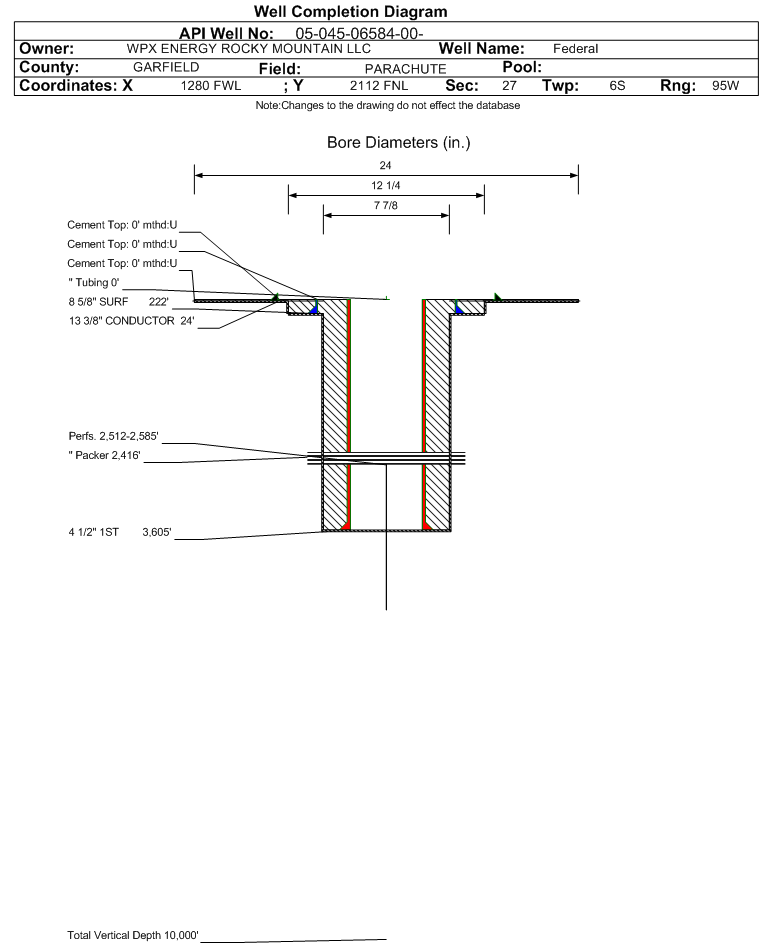 | Wellbore Completed | | Completion Date: | 10/20/1989 | | Measured TD: | 3650 ft. | Measured PB depth: | 3546 ft. | | True Vertical TD: | 0 ft. | True Vertical PB depth: | | | Top PZ Location: | Sec:27 Twp: 6S 95W | Footage: 1814 FNL 1309 FWL | | Casing: | String Type: CONDUCTOR, Hole Size: , Size: 13.375 in., Top: 0 ft., Depth: 24 ft., Weight: 24 , Citings Type: ACTUAL | | Cement: | Sacks: , Top: 0 ft., Bottom: 24 ft., Determination Method: VISU | | Casing: | String Type: SURF, Hole Size: 12.25 in., Size: 8.625 in., Top: 0 ft., Depth: 222 ft., Weight: 24 , Citings Type: ACTUAL | | Cement: | Sacks: 140, Top: 0 ft., Bottom: 222 ft., Determination Method: VISU | | Casing: | String Type: 1ST, Hole Size: 7.875 in., Size: 4.5 in., Top: 0 ft., Depth: 3605 ft., Weight: 10.5 , Citings Type: ACTUAL | | Cement: | Sacks: 400, Top: 2049 ft., Bottom: 3605 ft., Determination Method: CBL |