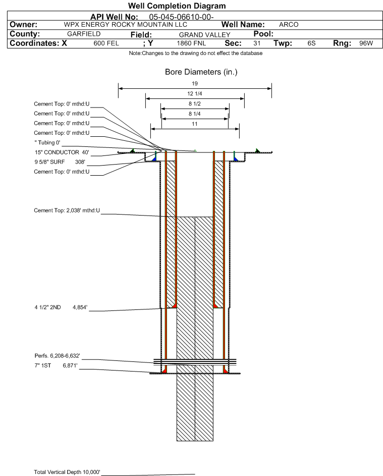 | | Perforation Data: | | Interval Top: | 6208 ft. | # Of Holes: | 37 | | Interval Bottom: | 6632 ft. | Hole Size: | |