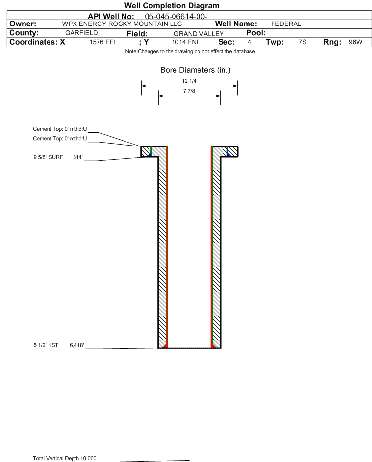 | Wellbore Completed | | Completion Date: | 12/11/1989 | | Measured TD: | 6440 ft. | Measured PB depth: | 6352 ft. | | True Vertical TD: | 0 ft. | True Vertical PB depth: | | | Casing: | String Type: SURF, Hole Size: 12.25 in., Size: 9.625 in., Top: 0 ft., Depth: 314 ft., Weight: , Citings Type: HISTORICAL | | Cement: | Sacks: 200, Top: 0 ft., Bottom: , Determination Method: | | Casing: | String Type: 1ST, Hole Size: 7.875 in., Size: 5.5 in., Top: 0 ft., Depth: 6418 ft., Weight: , Citings Type: HISTORICAL | | Cement: | Sacks: 0, Top: 0 ft., Bottom: , Determination Method: | | Formation | Interval Top | Log Bottom | Cored | DSTs | | FORT UNION | 1933 ft. | | | | | MESAVERDE | 3255 ft. | | | | | CAMEO COAL | 5790 ft. | | | | | ROLLINS | 6240 ft. | | | |