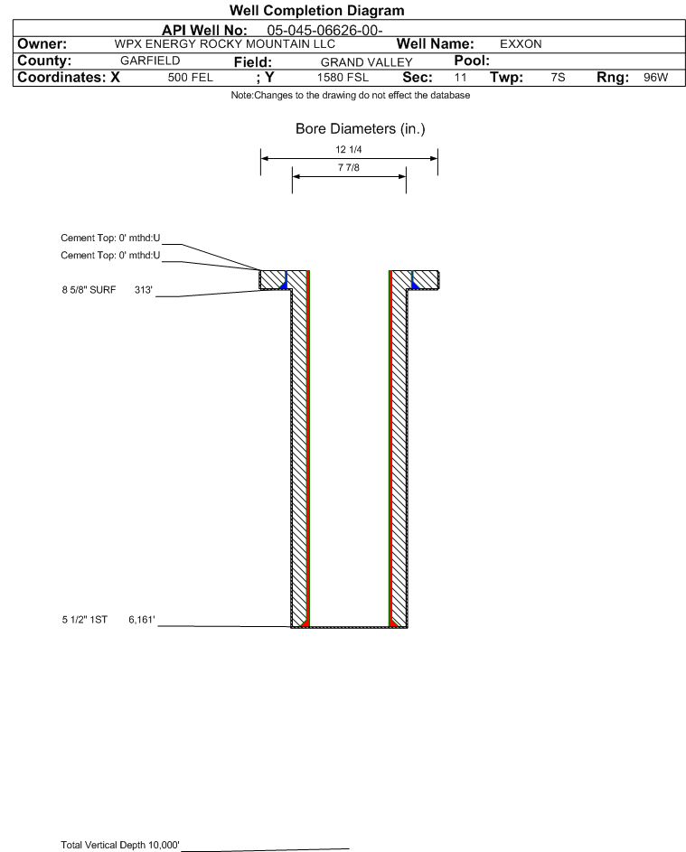 | Wellbore Completed | | Completion Date: | 3/10/1990 | | Measured TD: | 6180 ft. | Measured PB depth: | 0 ft. | | True Vertical TD: | 0 ft. | True Vertical PB depth: | | | Casing: | String Type: SURF, Hole Size: 12.25 in., Size: 8.625 in., Top: 0 ft., Depth: 313 ft., Weight: , Citings Type: HISTORICAL | | Cement: | Sacks: 200, Top: 0 ft., Bottom: , Determination Method: | | Casing: | String Type: 1ST, Hole Size: 7.875 in., Size: 5.5 in., Top: 0 ft., Depth: 6161 ft., Weight: , Citings Type: HISTORICAL | | Cement: | Sacks: 0, Top: 0 ft., Bottom: , Determination Method: | | Formation | Interval Top | Log Bottom | Cored | DSTs | | FORT UNION | 1568 ft. | | | | | MESAVERDE | 2972 ft. | | | | | CAMEO COAL | 5560 ft. | | | | | ROLLINS | 6011 ft. | | | |
