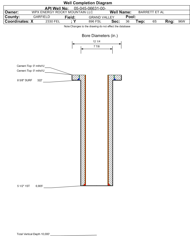 | Wellbore Completed | | Completion Date: | 2/20/1990 | | Measured TD: | 6900 ft. | Measured PB depth: | 6834 ft. | | True Vertical TD: | 0 ft. | True Vertical PB depth: | | | Casing: | String Type: SURF, Hole Size: 12.25 in., Size: 8.625 in., Top: 0 ft., Depth: 322 ft., Weight: , Citings Type: HISTORICAL | | Cement: | Sacks: 200, Top: 0 ft., Bottom: , Determination Method: | | Casing: | String Type: 1ST, Hole Size: 7.875 in., Size: 5.5 in., Top: 0 ft., Depth: 6905 ft., Weight: , Citings Type: HISTORICAL | | Cement: | Sacks: 0, Top: 0 ft., Bottom: , Determination Method: | | Formation | Interval Top | Log Bottom | Cored | DSTs | | FORT UNION | 2040 ft. | | | | | MESAVERDE | 3673 ft. | | | | | CAMEO COAL | 6234 ft. | | | | | ROLLINS | 6690 ft. | | | |