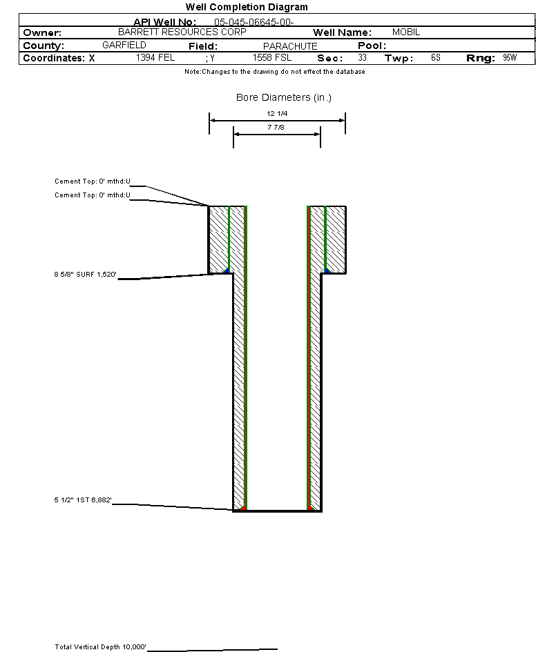 | Wellbore Completed | | Completion Date: | 3/30/1990 | | Measured TD: | 6900 ft. | Measured PB depth: | 6787 ft. | | True Vertical TD: | 0 ft. | True Vertical PB depth: | | | Casing: | String Type: SURF, Hole Size: 12.25 in., Size: 8.625 in., Top: 0 ft., Depth: 1520 ft., Weight: , Citings Type: HISTORICAL | | Cement: | Sacks: 850, Top: 0 ft., Bottom: , Determination Method: | | Casing: | String Type: 1ST, Hole Size: 7.875 in., Size: 5.5 in., Top: 0 ft., Depth: 6882 ft., Weight: , Citings Type: HISTORICAL | | Cement: | Sacks: 0, Top: 0 ft., Bottom: , Determination Method: | | Formation | Interval Top | Log Bottom | Cored | DSTs | | FORT UNION | 1690 ft. | | | | | MESAVERDE | 3432 ft. | | | | | CAMEO COAL | 6024 ft. | | | | | ROLLINS | 6750 ft. | | | |