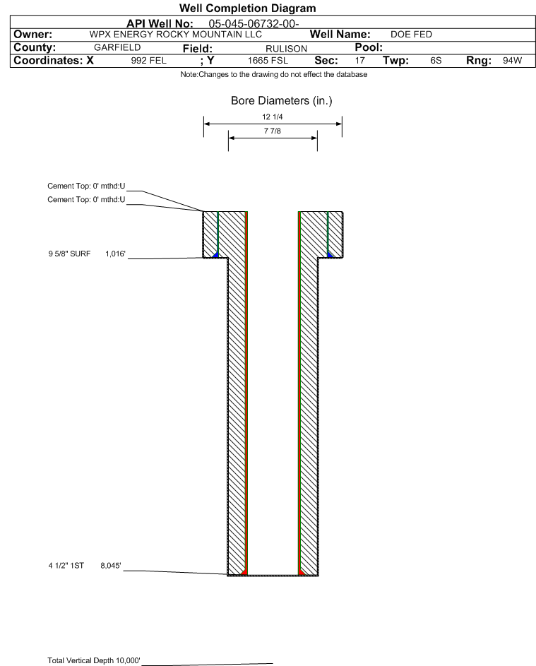| Wellbore Completed | | Completion Date: | 12/31/1990 | | Measured TD: | 8120 ft. | Measured PB depth: | 7982 ft. | | True Vertical TD: | 0 ft. | True Vertical PB depth: | | | Casing: | String Type: SURF, Hole Size: 12.25 in., Size: 9.625 in., Top: 0 ft., Depth: 1016 ft., Weight: , Citings Type: HISTORICAL | | Cement: | Sacks: 110, Top: 0 ft., Bottom: , Determination Method: | | Casing: | String Type: 1ST, Hole Size: 7.875 in., Size: 4.5 in., Top: 0 ft., Depth: 8045 ft., Weight: , Citings Type: HISTORICAL | | Cement: | Sacks: 0, Top: 0 ft., Bottom: , Determination Method: | | Formation | Interval Top | Log Bottom | Cored | DSTs | | WASATCH | 0 ft. | | | | | MESAVERDE | 4398 ft. | | | | | CAMEO COAL | 7150 ft. | | | | | ROLLINS | 8050 ft. | | | |