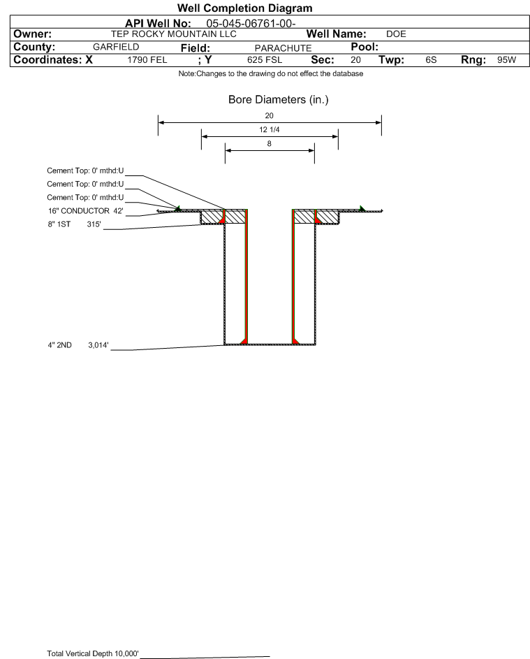 | Wellbore Completed | | Completion Date: | 10/8/1991 | | Measured TD: | 3048 ft. | Measured PB depth: | 0 ft. | | True Vertical TD: | 0 ft. | True Vertical PB depth: | | | Casing: | String Type: CONDUCTOR, Hole Size: , Size: 16 in., Top: 0 ft., Depth: 42 ft., Weight: , Citings Type: HISTORICAL | | Cement: | Sacks: 0, Top: 0 ft., Bottom: , Determination Method: | | Casing: | String Type: 1ST, Hole Size: 12.25 in., Size: 8 in., Top: 0 ft., Depth: 315 ft., Weight: , Citings Type: HISTORICAL | | Cement: | Sacks: 0, Top: 0 ft., Bottom: , Determination Method: | | Casing: | String Type: 2ND, Hole Size: , Size: 4 in., Top: 0 ft., Depth: 3014 ft., Weight: , Citings Type: HISTORICAL | | Cement: | Sacks: 0, Top: 0 ft., Bottom: , Determination Method: |