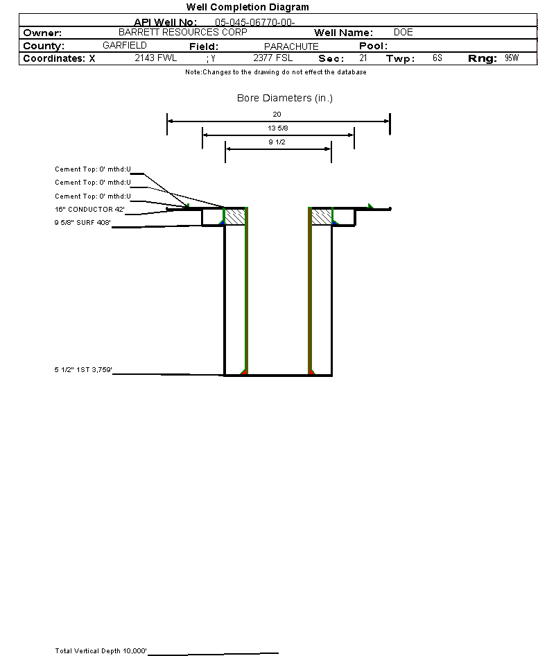 | Wellbore Completed | | Completion Date: | 10/12/1991 | | Measured TD: | 3780 ft. | Measured PB depth: | 3690 ft. | | True Vertical TD: | 0 ft. | True Vertical PB depth: | | | Casing: | String Type: CONDUCTOR, Hole Size: , Size: 16 in., Top: 0 ft., Depth: 42 ft., Weight: , Citings Type: HISTORICAL | | Cement: | Sacks: 0, Top: 0 ft., Bottom: , Determination Method: | | Casing: | String Type: SURF, Hole Size: , Size: 9.625 in., Top: 0 ft., Depth: 408 ft., Weight: , Citings Type: HISTORICAL | | Cement: | Sacks: 0, Top: 0 ft., Bottom: , Determination Method: | | Casing: | String Type: 1ST, Hole Size: , Size: 5.5 in., Top: 0 ft., Depth: 3759 ft., Weight: , Citings Type: HISTORICAL | | Cement: | Sacks: 0, Top: 0 ft., Bottom: , Determination Method: | | Formation | Interval Top | Log Bottom | Cored | DSTs | | WASATCH | 3436 ft. | | | |