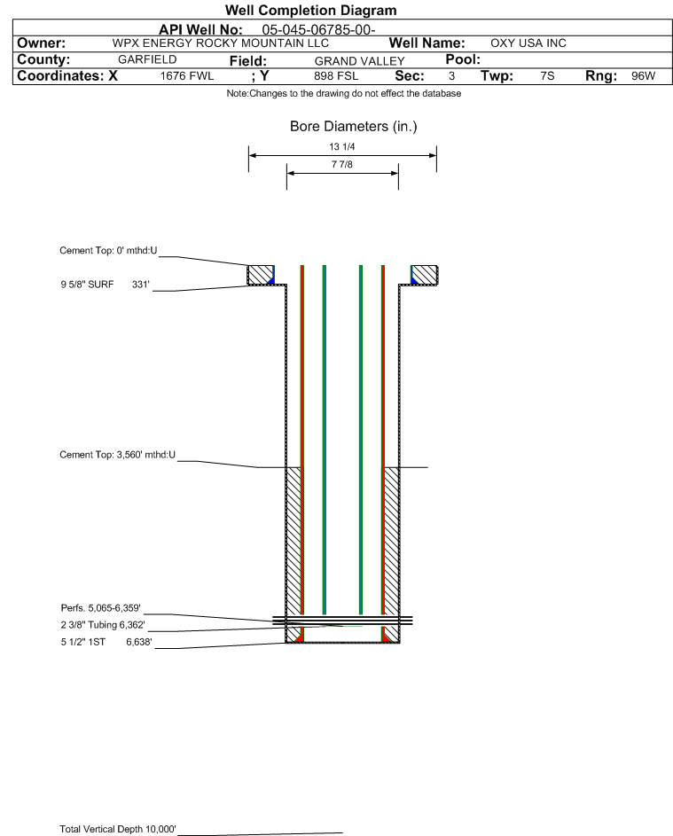 | Wellbore Completed | | Completion Date: | 9/7/1994 | | Measured TD: | 6640 ft. | Measured PB depth: | 0 ft. | | True Vertical TD: | 0 ft. | True Vertical PB depth: | | | Casing: | String Type: SURF, Hole Size: 13.25 in., Size: 9.625 in., Top: 0 ft., Depth: 331 ft., Weight: 36 , Citings Type: ACTUAL | | Cement: | Sacks: 150, Top: 0 ft., Bottom: , Determination Method: | | Casing: | String Type: 1ST, Hole Size: 7.875 in., Size: 5.5 in., Top: 0 ft., Depth: 6638 ft., Weight: 17 , Citings Type: ACTUAL | | Cement: | Sacks: 941, Top: 3560 ft., Bottom: 6638 ft., Determination Method: CBL | | Formation | Interval Top | Log Bottom | Cored | DSTs | | FORT UNION | 2250 ft. | | | | | MESAVERDE | 3590 ft. | | | | | CAMEO COAL | 6030 ft. | | | |