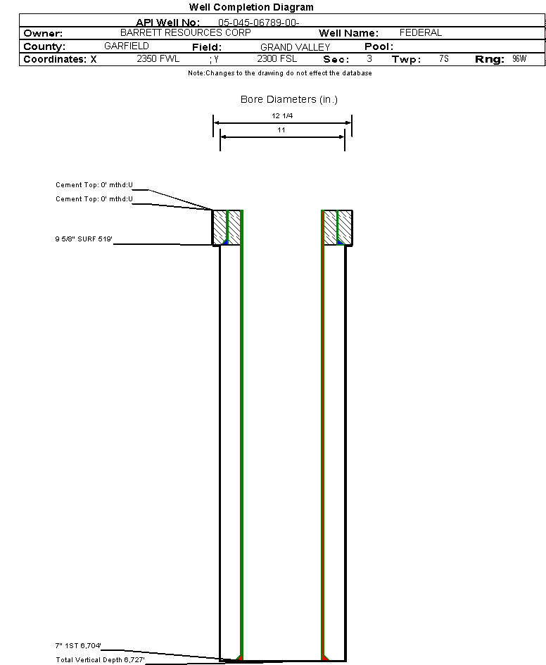 | Wellbore Completed | | Completion Date: | 10/30/1995 | | Spud Date: | 5/14/1993 | Spud Date Is: | ACTUAL | | Measured TD: | 7167 ft. | Measured PB depth: | 0 ft. | | True Vertical TD: | 6727 ft. | True Vertical PB depth: | | | Casing: | String Type: SURF, Hole Size: 12.25 in., Size: 9.625 in., Top: 0 ft., Depth: 519 ft., Weight: , Citings Type: HISTORICAL | | Cement: | Sacks: 275, Top: 0 ft., Bottom: , Determination Method: | | Casing: | String Type: 1ST, Hole Size: , Size: 7 in., Top: 0 ft., Depth: 6704 ft., Weight: , Citings Type: HISTORICAL | | Cement: | Sacks: 0, Top: 0 ft., Bottom: , Determination Method: | | Formation | Interval Top | Log Bottom | Cored | DSTs | | FORT UNION | 2090 ft. | | | | | MESAVERDE | 3404 ft. | | | | | CAMEO COAL | 5957 ft. | | | | | ROLLINS | 6443 ft. | | | | | COZZETTE | 6817 ft. | | | |