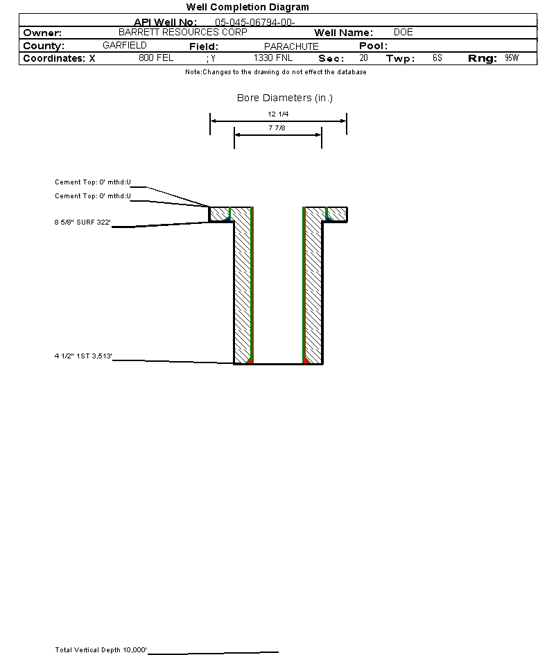 | Wellbore Completed | | Completion Date: | 9/8/1993 | | Measured TD: | 3535 ft. | Measured PB depth: | 3421 ft. | | True Vertical TD: | 0 ft. | True Vertical PB depth: | | | Casing: | String Type: SURF, Hole Size: 12.25 in., Size: 8.625 in., Top: 0 ft., Depth: 322 ft., Weight: , Citings Type: HISTORICAL | | Cement: | Sacks: 290, Top: 0 ft., Bottom: , Determination Method: | | Casing: | String Type: 1ST, Hole Size: 7.875 in., Size: 4.5 in., Top: 0 ft., Depth: 3513 ft., Weight: , Citings Type: HISTORICAL | | Cement: | Sacks: 0, Top: 0 ft., Bottom: , Determination Method: | | Formation | Interval Top | Log Bottom | Cored | DSTs | | WASATCH | 370 ft. | | | |