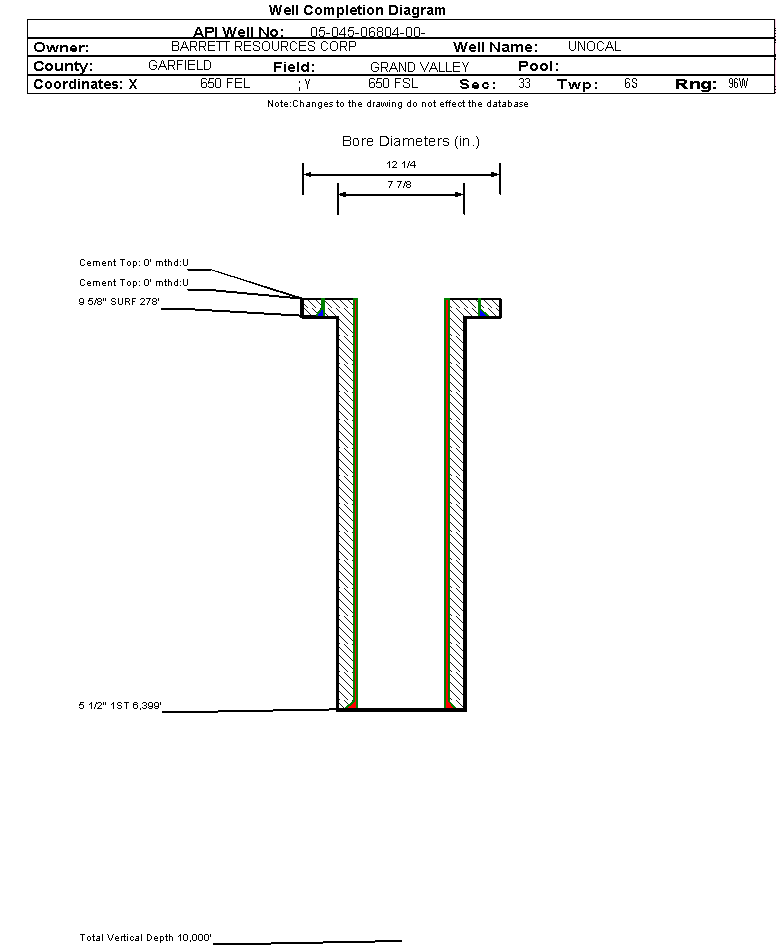 | Wellbore Completed | | Completion Date: | 9/24/1993 | | Measured TD: | 6410 ft. | Measured PB depth: | 0 ft. | | True Vertical TD: | 0 ft. | True Vertical PB depth: | | | Casing: | String Type: SURF, Hole Size: 12.25 in., Size: 9.625 in., Top: 0 ft., Depth: 278 ft., Weight: , Citings Type: HISTORICAL | | Cement: | Sacks: 130, Top: 0 ft., Bottom: , Determination Method: | | Casing: | String Type: 1ST, Hole Size: 7.875 in., Size: 5.5 in., Top: 0 ft., Depth: 6399 ft., Weight: , Citings Type: HISTORICAL | | Cement: | Sacks: 0, Top: 0 ft., Bottom: , Determination Method: | | Formation | Interval Top | Log Bottom | Cored | DSTs | | FORT UNION | 1959 ft. | | | | | MESAVERDE | 3297 ft. | | | | | CAMEO COAL | 5838 ft. | | | | | ROLLINS | 6320 ft. | | | |