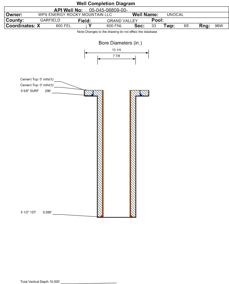 Wellbore #00 Wellbore Classification: GW Status: PR - 8/28/1994 Measured TD: 6590 ft. Vertical TD: 0 ft.| Wellbore Data for Original Wellbore | Wellbore Classification: GW PR - 8/28/1994 | | Wellbore Permit | DRIFTED | | Permit #: | 931164 | Expiration Date: | 4/22/1994 | | Bottom Hole Location: | Sec:33 Twp: 6S 94W | Footage: 864 FNL 609 FEL | | Proposed Depth/Form: | | | Surface Mineral Owner Same: | No | | Mineral Owner: | FEE | Surface Owner: | Not available | | Unit: | | Unit Number: | | | Formation And Spacing: | Code: WFCM , Formation: WILLIAMS FORK - CAMEO , Order: 0 , Unit Acreage: 160, Drill Unit: NE4 |
