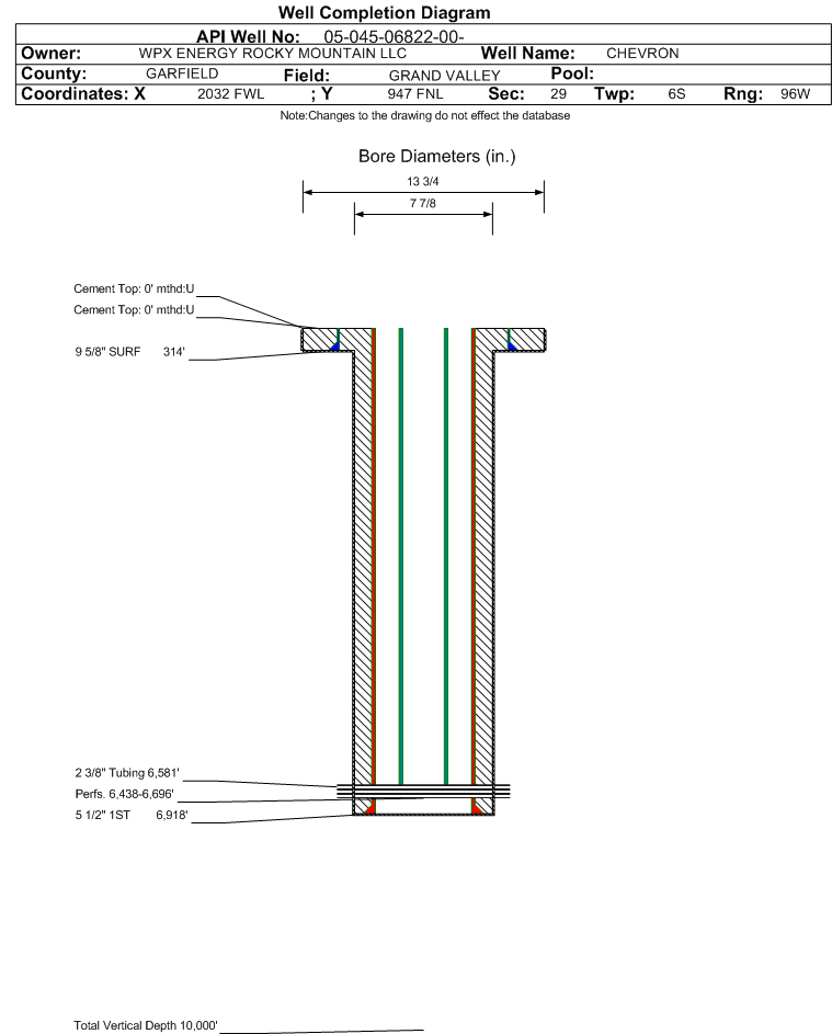 | | Perforation Data: | | Interval Top: | 6438 ft. | # Of Holes: | 30 | | Interval Bottom: | 6696 ft. | Hole Size: | 0.35 in. |