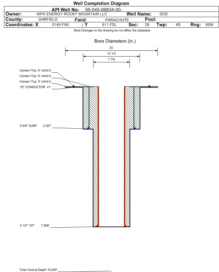 | Wellbore Completed | | Completion Date: | 2/2/1995 | | Measured TD: | 7595 ft. | Measured PB depth: | 7511 ft. | | True Vertical TD: | 0 ft. | True Vertical PB depth: | | | Casing: | String Type: CONDUCTOR, Hole Size: 20 in., Size: 16 in., Top: 0 ft., Depth: 41 ft., Weight: , Citings Type: HISTORICAL | | Cement: | Sacks: 0, Top: 0 ft., Bottom: , Determination Method: | | Casing: | String Type: SURF, Hole Size: 12.25 in., Size: 9.625 in., Top: 0 ft., Depth: 2307 ft., Weight: , Citings Type: HISTORICAL | | Cement: | Sacks: 0, Top: 0 ft., Bottom: , Determination Method: | | Casing: | String Type: 1ST, Hole Size: 7.875 in., Size: 5.5 in., Top: 0 ft., Depth: 7598 ft., Weight: , Citings Type: HISTORICAL | | Cement: | Sacks: 0, Top: 0 ft., Bottom: , Determination Method: | | Formation | Interval Top | Log Bottom | Cored | DSTs | | WILLIAMS FORK | 3670 ft. | | | | | ILES | 7373 ft. | | | | | MANCOS | 7478 ft. | | | |