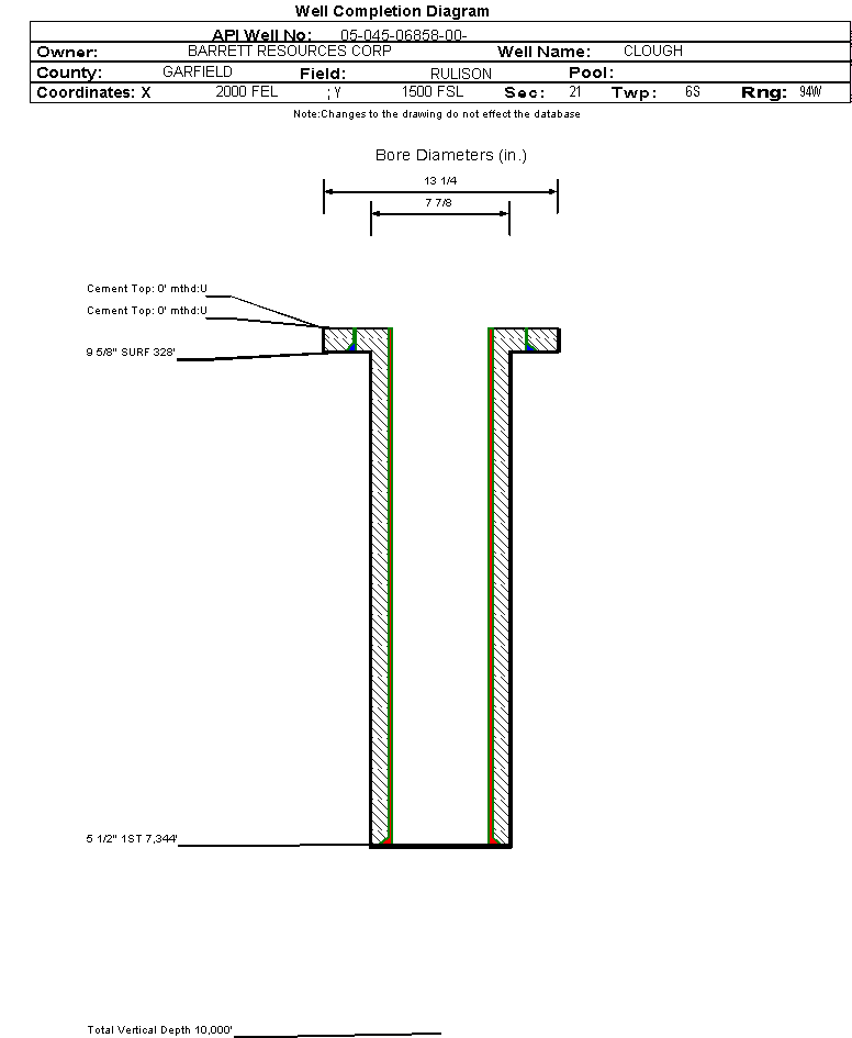 | Wellbore Completed | | Completion Date: | 11/3/1994 | | Measured TD: | 7350 ft. | Measured PB depth: | 0 ft. | | True Vertical TD: | 0 ft. | True Vertical PB depth: | | | Casing: | String Type: SURF, Hole Size: 13.25 in., Size: 9.625 in., Top: 0 ft., Depth: 328 ft., Weight: , Citings Type: HISTORICAL | | Cement: | Sacks: 150, Top: 0 ft., Bottom: , Determination Method: | | Casing: | String Type: 1ST, Hole Size: 7.875 in., Size: 5.5 in., Top: 0 ft., Depth: 7344 ft., Weight: , Citings Type: HISTORICAL | | Cement: | Sacks: 0, Top: 0 ft., Bottom: , Determination Method: | | Formation | Interval Top | Log Bottom | Cored | DSTs | | MESAVERDE | 4014 ft. | | | | | CAMEO | 6790 ft. | | | |