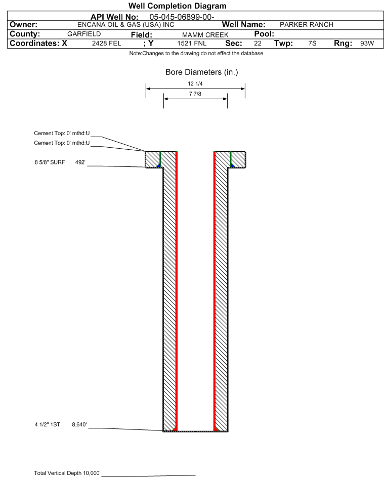 | Wellbore Completed | | Completion Date: | 12/16/1994 | | Measured TD: | 8640 ft. | Measured PB depth: | 8575 ft. | | True Vertical TD: | 0 ft. | True Vertical PB depth: | | | Casing: | String Type: SURF, Hole Size: 12.25 in., Size: 8.625 in., Top: 0 ft., Depth: 492 ft., Weight: , Citings Type: HISTORICAL | | Cement: | Sacks: 355, Top: 0 ft., Bottom: , Determination Method: | | Casing: | String Type: 1ST, Hole Size: 7.875 in., Size: 4.5 in., Top: 0 ft., Depth: 8640 ft., Weight: , Citings Type: HISTORICAL | | Cement: | Sacks: 0, Top: 0 ft., Bottom: , Determination Method: | | Formation | Interval Top | Log Bottom | Cored | DSTs | | OHIO CREEK | 4796 ft. | | | | | MESAVERDE | 4944 ft. | | | | | CAMEO | 7962 ft. | | | | | ROLLINS | 8580 ft. | | | |