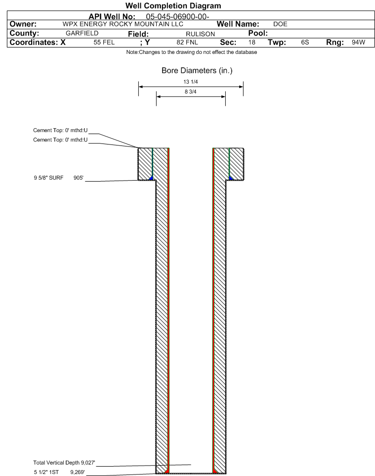 | Wellbore Completed | | Completion Date: | 11/9/1994 | | Spud Date: | 9/19/1994 | Spud Date Is: | ACTUAL | | Measured TD: | 9295 ft. | Measured PB depth: | 9190 ft. | | True Vertical TD: | 9027 ft. | True Vertical PB depth: | 8991 ft. | | Top PZ Location: | Sec:8 Twp: 6S 94W | Footage: 831 FSL 682 FWL | | Bottom Hole Location: | Sec:8 Twp: 6S 94W | Footage: 862 FSL 676 FWL | | Log Types: | CBL | | Casing: | String Type: CONDUCTOR, Hole Size: , Size: , Top: 0 ft., Depth: 30 ft., Weight: 31.75 , Citings Type: ACTUAL | | Cement: | Sacks: 11, Top: 0 ft., Bottom: 30 ft., Determination Method: VISU | | Casing: | String Type: SURF, Hole Size: 13.5 in., Size: 9.625 in., Top: 0 ft., Depth: 905 ft., Weight: 36 , Citings Type: ACTUAL | | Cement: | Sacks: 440, Top: 0 ft., Bottom: 905 ft., Determination Method: VISU | | Casing: | String Type: 1ST, Hole Size: 8.75 in., Size: 5.5 in., Top: 0 ft., Depth: 9269 ft., Weight: 17 & 23 , Citings Type: ACTUAL | | Cement: | Sacks: 2000, Top: 3810 ft., Bottom: 9269 ft., Determination Method: CBL | | Casing: | String Type: S.C. 1.1, Hole Size: 8.75 in., Size: 5.5 in., Top: , Depth: 3047 ft., Weight: , Citings Type: ACTUAL | | Cement: | Sacks: 1390, Top: 1310 ft., Bottom: 3047 ft., Determination Method: CBL | | Casing: | String Type: S.C. 1.2, Hole Size: , Size: , Top: , Depth: 5761 ft., Weight: , Citings Type: ACTUAL | | Cement: | Sacks: 150, Top: 4680 ft., Bottom: 5761 ft., Determination Method: CALC | | Casing: | String Type: STAGE TOOL, Hole Size: , Size: , Top: , Depth: 3058 ft., Weight: , Citings Type: ACTUAL | | Cement: | Sacks: 1390, Top: 550 ft., Bottom: 3065 ft., Determination Method: CBL | | Additional Cement: | String Type: 1ST , Top: 4680 ft., Depth: 4680 ft., Bottom: 5761 ft., Sacks: 150, Method: SQUEEZE | | Formation | Interval Top | Log Bottom | Cored | DSTs | | WASATCH G | 2862 ft. | | | | | WILLIAMS FORK | 5409 ft. | | | | | MESAVERDE | 5409 ft. | | | | | CAMEO | 8139 ft. | | | | | CAMEO COAL | 8160 ft. | | | | | ROLLINS | 9054 ft. | | | | | MANCOS | 9148 ft. | | | |