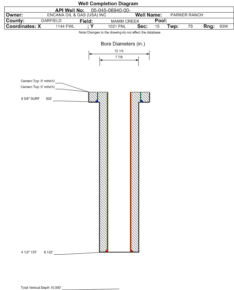 | Wellbore Completed | | Completion Date: | 7/3/1996 | | Measured TD: | 8128 ft. | Measured PB depth: | 8040 ft. | | True Vertical TD: | 0 ft. | True Vertical PB depth: | | | Casing: | String Type: SURF, Hole Size: 12.25 in., Size: 8.625 in., Top: 0 ft., Depth: 502 ft., Weight: , Citings Type: HISTORICAL | | Cement: | Sacks: 360, Top: 0 ft., Bottom: , Determination Method: | | Casing: | String Type: 1ST, Hole Size: 7.875 in., Size: 4.5 in., Top: 0 ft., Depth: 8122 ft., Weight: , Citings Type: HISTORICAL | | Cement: | Sacks: 0, Top: 0 ft., Bottom: , Determination Method: | | Formation | Interval Top | Log Bottom | Cored | DSTs | | WILLIAMS FORK | 6591 ft. | | | |