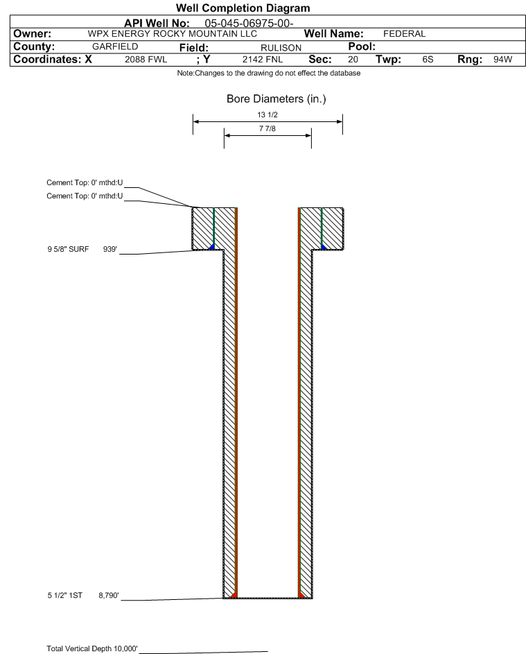 | Wellbore Completed | | Completion Date: | 6/11/1996 | | Measured TD: | 8790 ft. | Measured PB depth: | 0 ft. | | True Vertical TD: | 0 ft. | True Vertical PB depth: | | | Casing: | String Type: SURF, Hole Size: 13.5 in., Size: 9.625 in., Top: 0 ft., Depth: 939 ft., Weight: , Citings Type: HISTORICAL | | Cement: | Sacks: 395, Top: 0 ft., Bottom: , Determination Method: | | Casing: | String Type: 1ST, Hole Size: 7.875 in., Size: 5.5 in., Top: 0 ft., Depth: 8790 ft., Weight: , Citings Type: HISTORICAL | | Cement: | Sacks: 0, Top: 0 ft., Bottom: , Determination Method: | | Formation | Interval Top | Log Bottom | Cored | DSTs | | WASATCH G | 1936 ft. | | | | | MESAVERDE | 4321 ft. | | | | | CAMEO COAL | 7010 ft. | | | | | ROLLINS | 7938 ft. | | | | | COZZETTE | 8282 ft. | | | | | CORCORAN | 8576 ft. | | | |